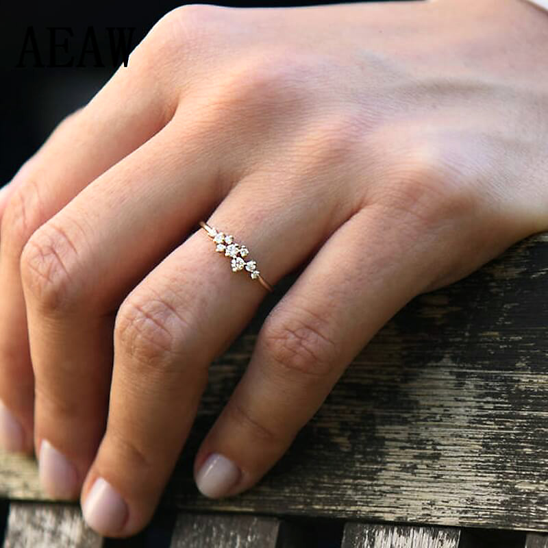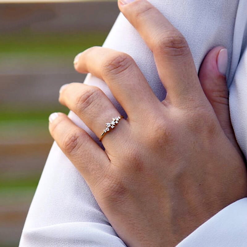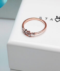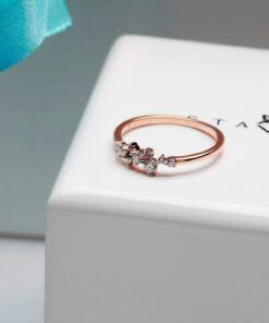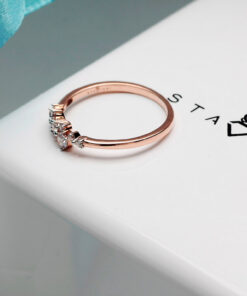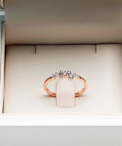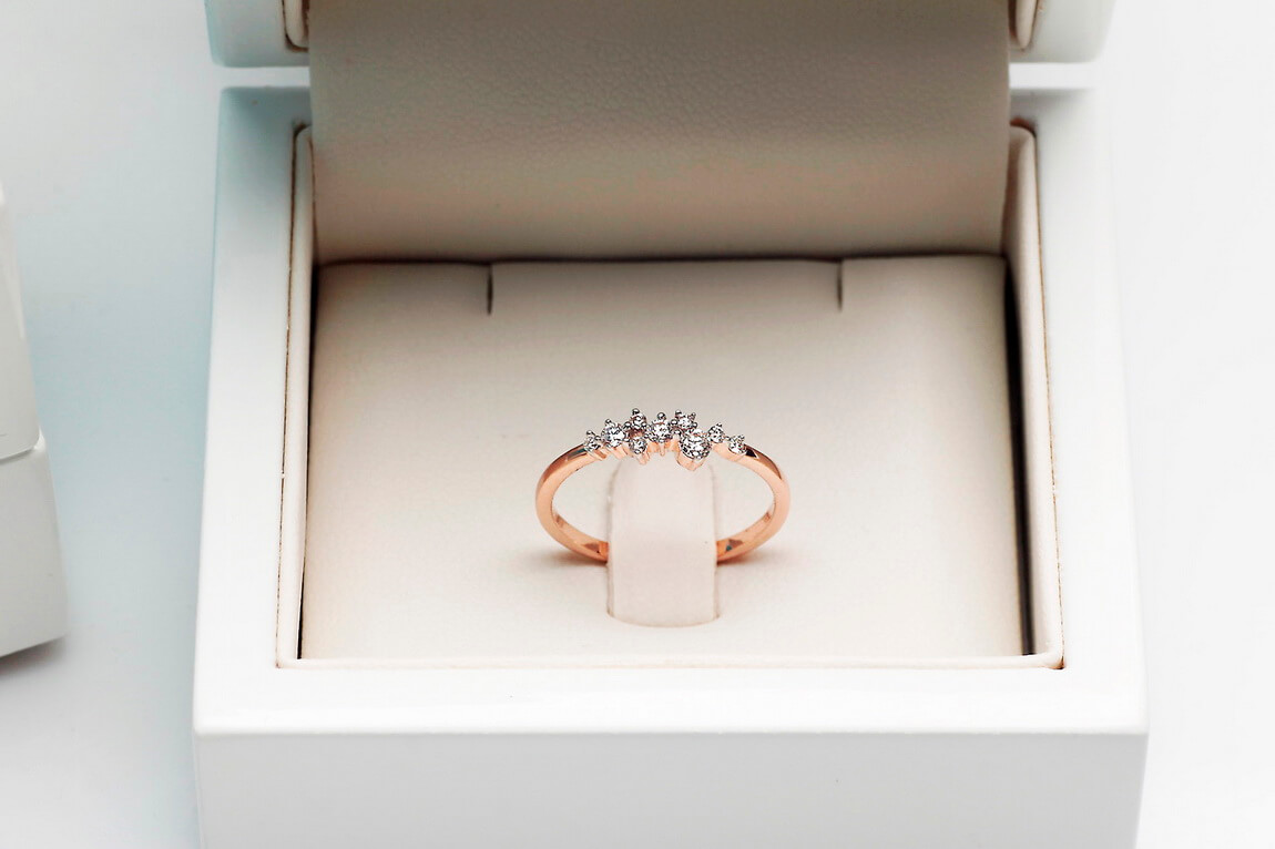 Subtelny i niezwykle romantyczny pierścionek zaręczynowy z 9 diamentami o łącznej masie 0,20 ct, osadzonymi w smukłej szynie z 14-karatowego różowego złota. Asymetryczny układ kamieni tworzy efekt lekkiego rozbłysku, dodając całości finezyjnego charakteru. Idealna propozycja dla kobiet ceniących delikatność, nowoczesność i szczyptę błysku w eleganckiej formie.
