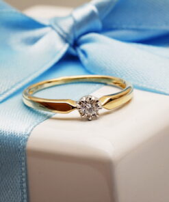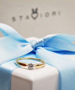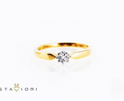 Elegancki pierścionek zaręczynowy z żółtego i białego złota próby 0,750, ozdobiony subtelnym brylantem o masie 0,15 ct. Klasyczna forma z delikatnie profilowaną szyną oraz korona z sześcioma łapkami doskonale eksponują kamień, nadając całości szlachetnego charakteru. To idealna propozycja dla osób ceniących ponadczasowe piękno i włoską precyzję wykonania.