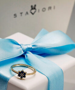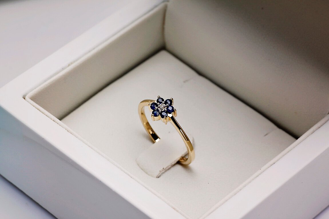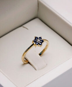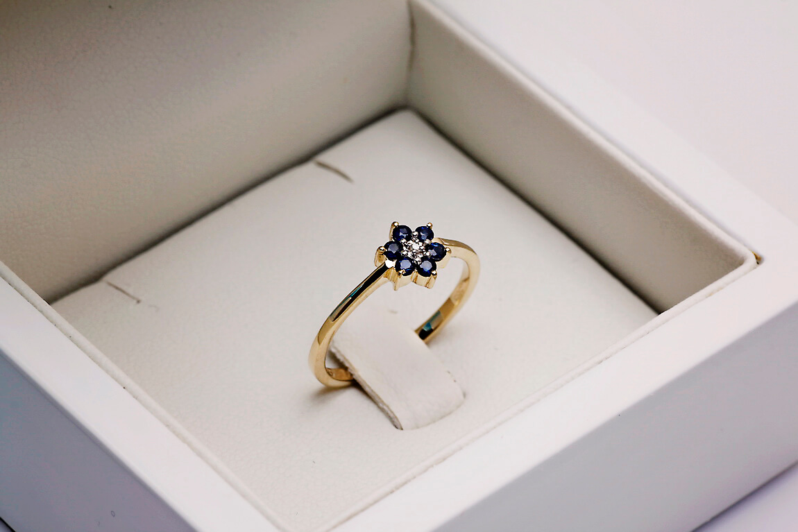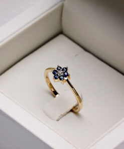 Uroczy pierścionek z żółtego złota 14k, którego korona przybiera kształt kwiatka. W centrum lśni drobny diament, a jego płatki tworzy sześć niebieskich szafirów o łącznej masie 0,20 ct. Delikatny i pełen wdzięku, będzie idealnym wyborem dla kobiet ceniących subtelną biżuterię o romantycznym charakterze.