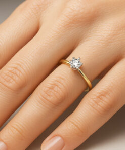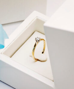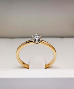 Klasyczny pierścionek zaręczynowy typu Tiffany z lśniącym diamentem o masie 0,25ct. Kamień w oprawie z sześciu łapek wykonanej z białego złota cudownie współgra z żółtym 14-karatowym złotem obrączki. Subtelny, a zarazem niezwykle elegancki – symbol miłości i ponadczasowego stylu. Idealny wybór na zaręczyny pełne blasku i emocji.
