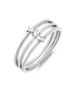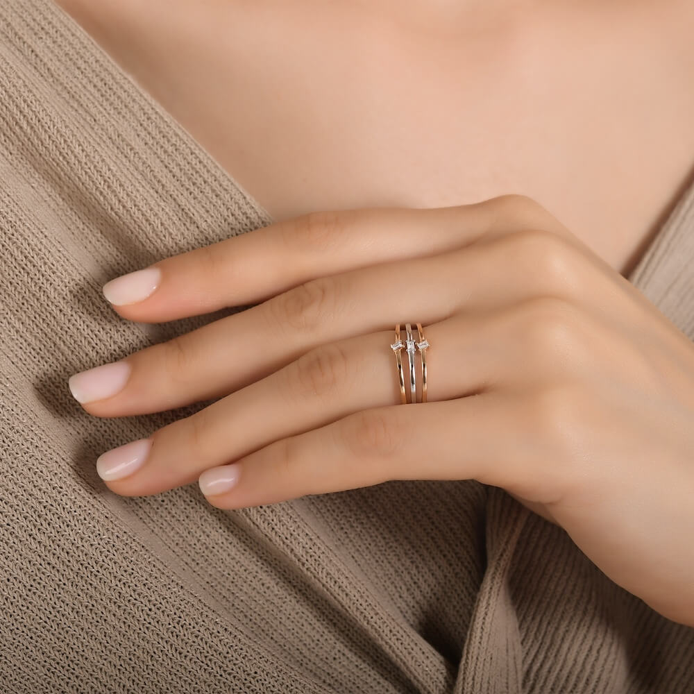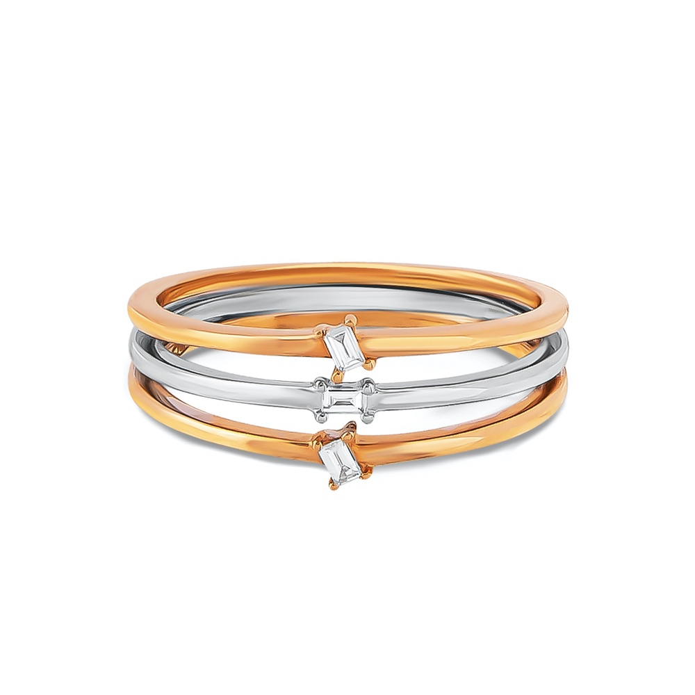 A modern and original ring made of a combination of yellow and white gold 0.750. Its unique form consisting of three slender rings is decorated with three baguette-cut diamonds, which add elegance and geometric character. This is a unique model for women who appreciate unconventional style and timeless beauty. Also available in other gold colour variants to suit individual tastes.