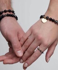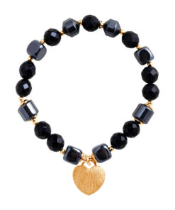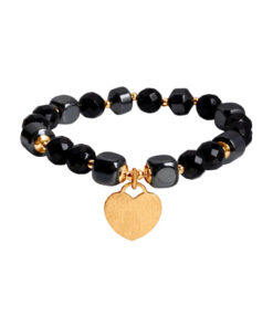 Wyjątkowa bransoletka o długości 20 cm, wykonana ze srebra próby 0,925 pokrytego żółtym złotem. Subtelnie połyskujące kuleczki z hematytu zestawiono z eleganckimi onyksem, tworząc harmonijną kompozycję kontrastujących faktur i głębokich odcieni czerni. Złocone akcenty dodają ciepła, a naturalne kamienie wprowadzają wyrafinowany charakter — idealny do zarówno codziennych, jak i wieczorowych stylizacji.