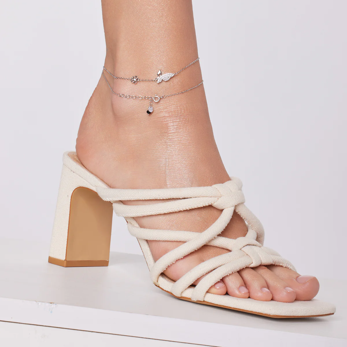 Delikatna bransoletka na nogę wykonana z rodowanego srebra próby 0,925, o długości regulowanej 23–25 cm. Subtelny łańcuszek zdobi pojedyncza czarna cyrkonia, która dyskretnie przyciąga uwagę i podkreśla linię kostki. Lekka, minimalistyczna forma sprawia, że model doskonale komponuje się z letnimi stylizacjami.