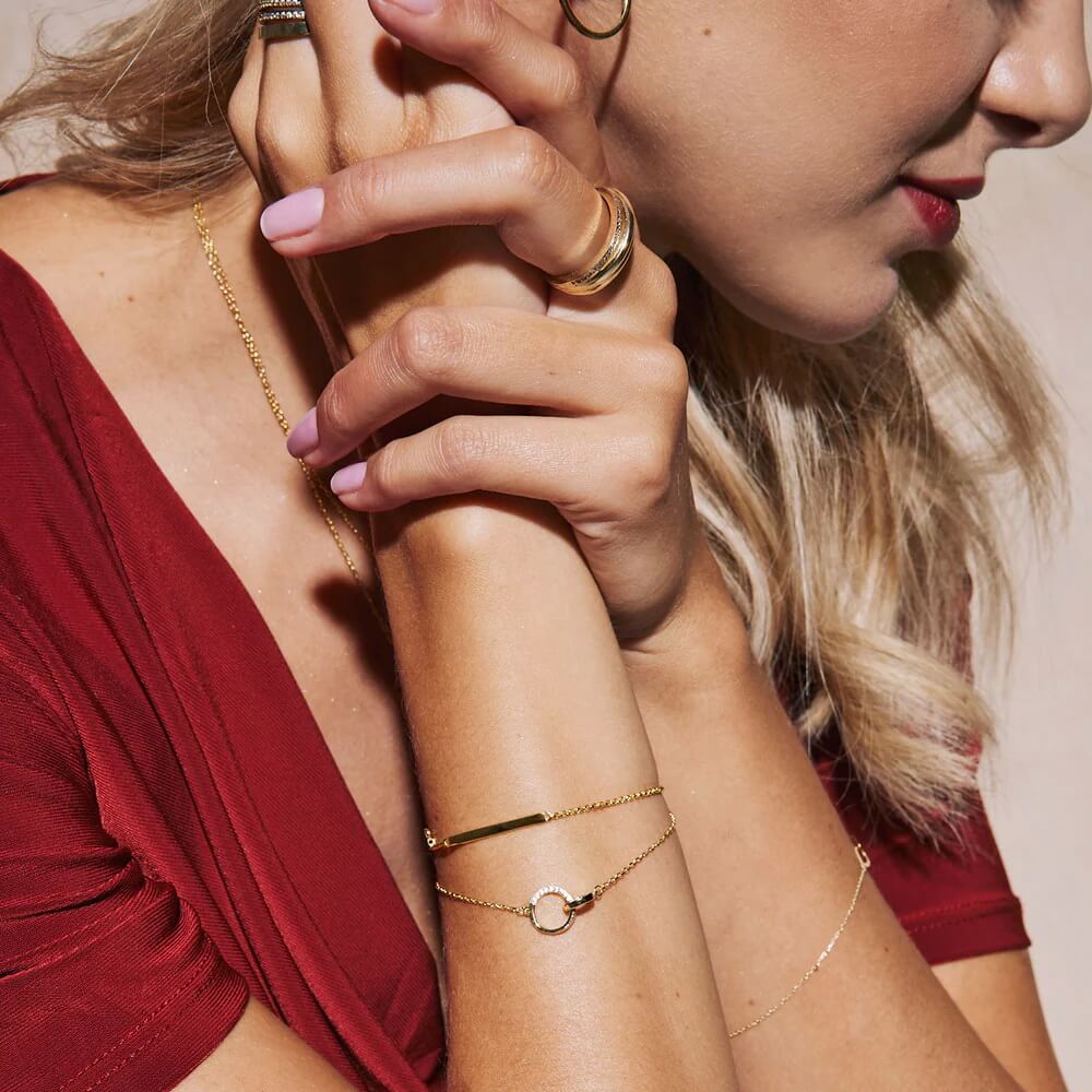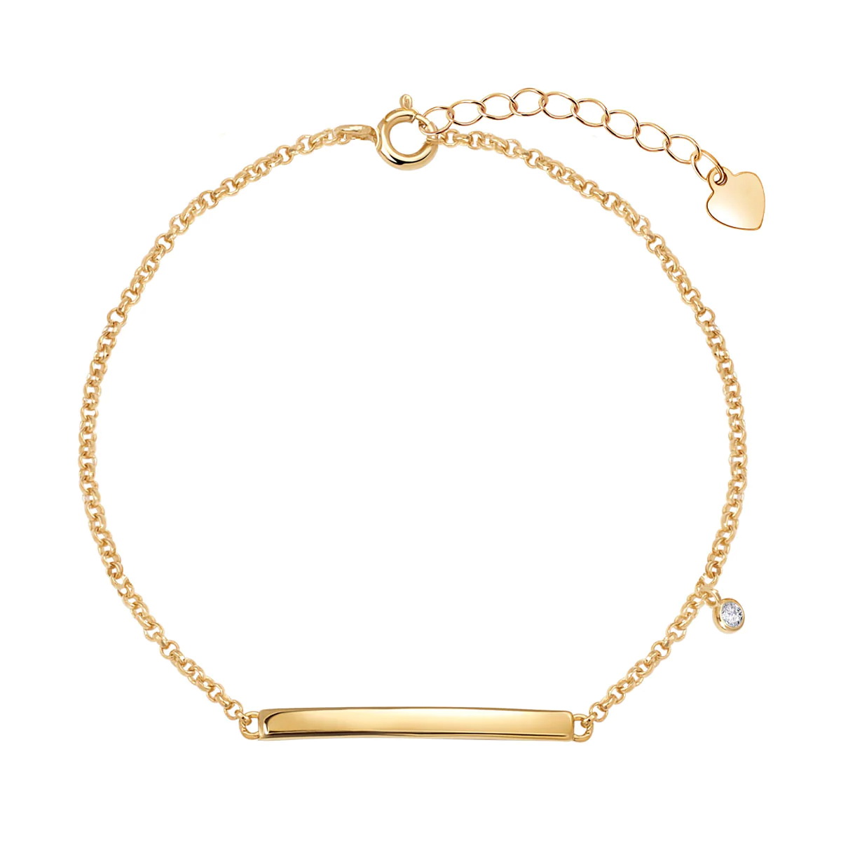 Subtelna bransoletka wykonana z najwyższej jakości pozłacanego srebra próby 925, łącząca w sobie klasyczną elegancję z nowoczesnym akcentem. Centralny element stanowi gładka, lśniąca blaszka, która idealnie nadaje się pod personalizowany grawer, nadając biżuterii unikalny charakter. Całość dopełnia delikatny łańcuszek ozdobiony pojedynczą, lśniącą cyrkonią, która pięknie rozprasza światło przy każdym ruchu nadgarstka. To doskonały wybór na prezent, łączący sentymentalną wartość z wyrafinowanym stylem.