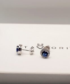 Subtelne i pełne blasku kolczyki na sztyfcie wykonane ze srebra próby 0,925 zachwycają swoim eleganckim wyglądem. Centralne miejsce zajmuje intensywnie niebieska cyrkonia, otoczona lśniącym okręgiem z bezbarwnych kamieni, które pięknie odbijają światło. Idealne do noszenia na co dzień, jak i na wyjątkowe okazje – dodają szyku i klasy każdej stylizacji. To ponadczasowa biżuteria, która podkreśli kobiecą delikatność i zmysł estetyki.