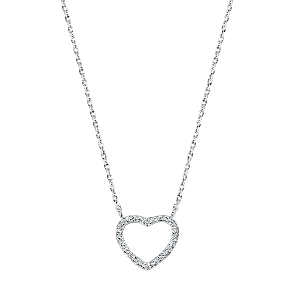 Subtle necklace made of sterling silver, decorated with an openwork heart set with shining zircons. The delicate heart motif symbolises love and closeness, making this model a perfect gift idea for a loved one. The shine of the silver and zircons adds elegance to the jewellery and makes the necklace illuminate the neckline beautifully. The perfect choice for any occasion - whether for everyday wear or special moments.