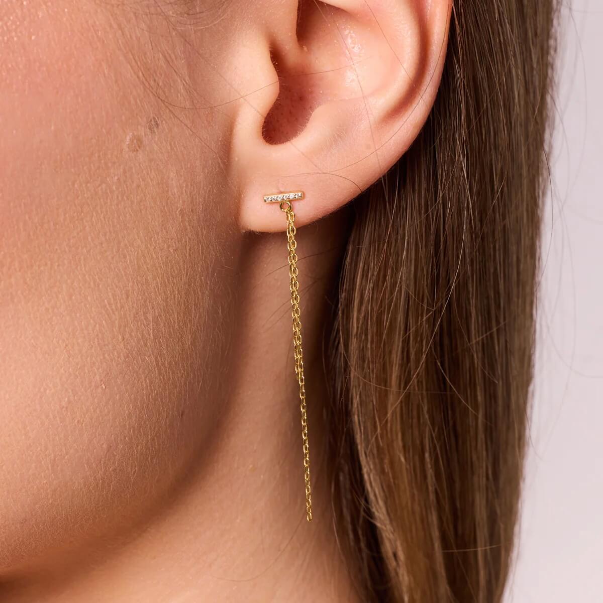 Nowoczesny komplet biżuterii wykonany ze srebra próby 0,925, pokrytego żółtym złotem. Składa się z naszyjnika i kolczyków, których minimalistyczna forma podkreślona jest subtelnym blaskiem cyrkonii. Smukłe łańcuszki dodają całości lekkości i elegancji, czyniąc zestaw idealnym wyborem zarówno do codziennych, jak i wieczorowych stylizacji.