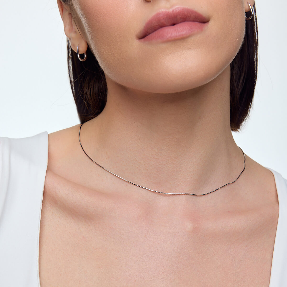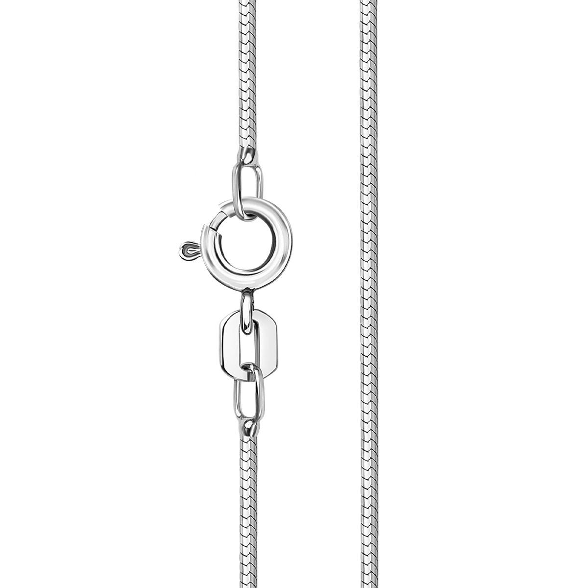 Elegant sterling silver adder chain, made from rhodium-plated sterling silver, characterised by a smooth, flexible surface that adheres beautifully to the skin and shines with a subtle sparkle. Perfect to wear on its own or with a striking pendant. A modern yet timeless accessory that will add a touch of class to any styling.