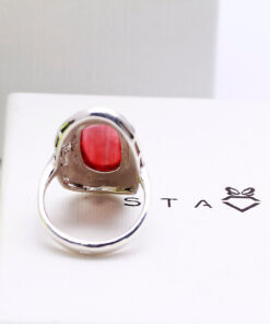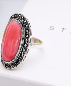 silver beautiful large ring with coral and marcasites