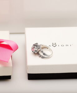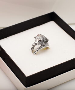 Uroczy i pełen charakteru pierścionek wykonany ze srebra próby 0,925, przedstawiający psa oplatającego palec. Misterne detale oraz lśniące markazyty i czerwone afrykańskie granaty w oczach nadają mu niezwykłej głębi i wyrazistości. Idealny wybór dla miłośników zwierząt i wyjątkowej biżuterii z duszą. Pierścionek, który nie tylko zdobi, ale także wyraża emocje.