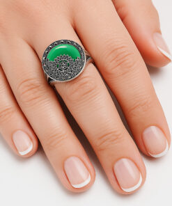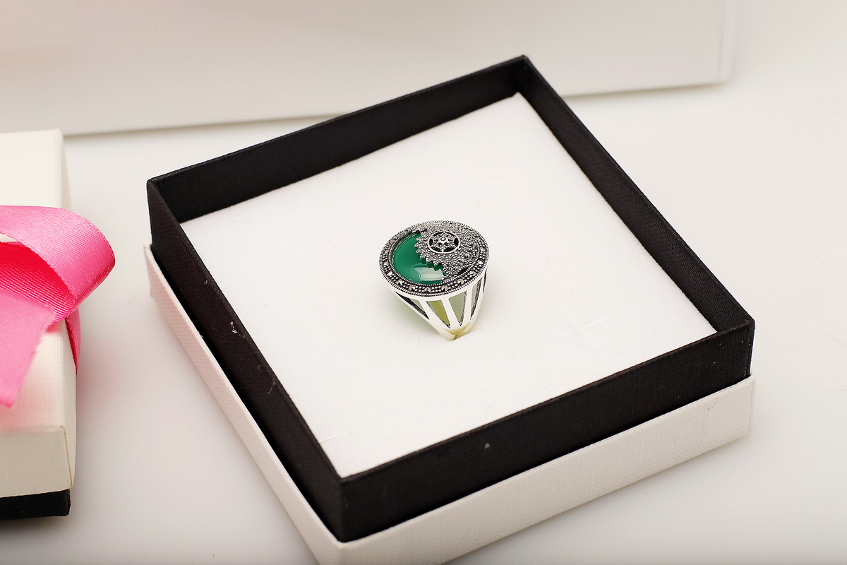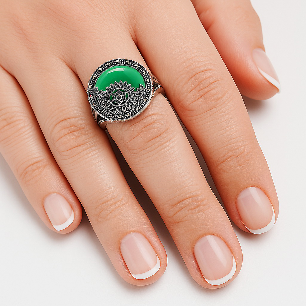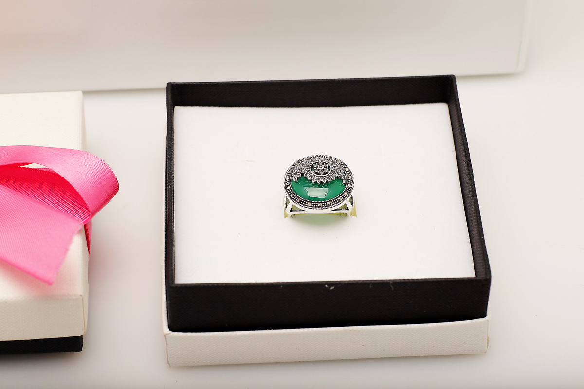 Impressive sterling silver ring made of sterling silver 0.925, decorated with a beautiful, green agate and intricately framed marcasites. Richly decorated, openwork composition in vintage style catches the eye and gives the whole an artistic character. An ideal choice for women who appreciate original and expressive jewellery with a soul.