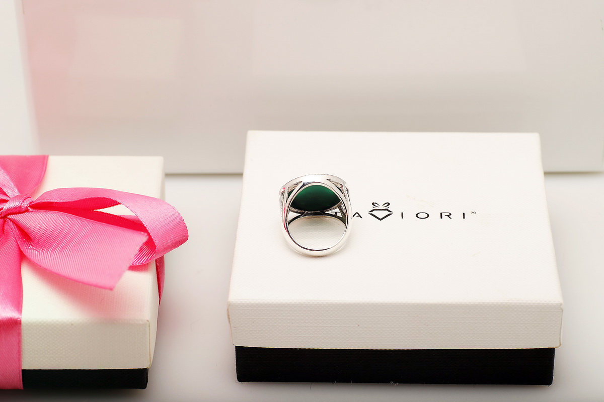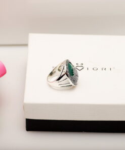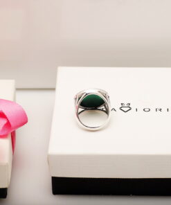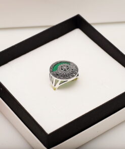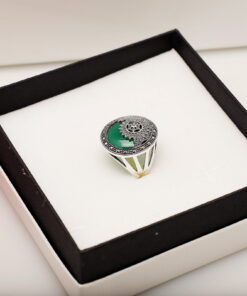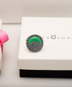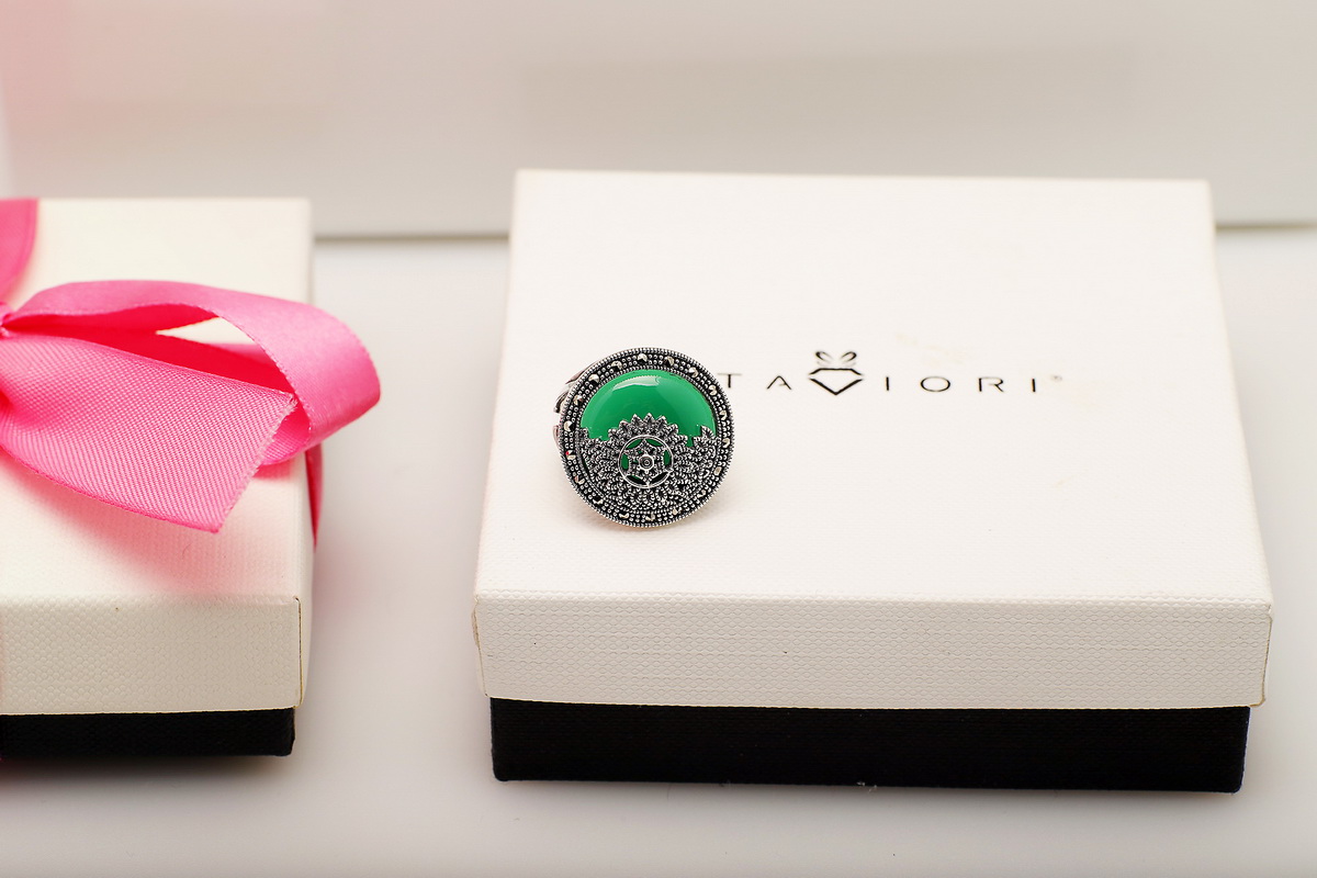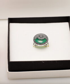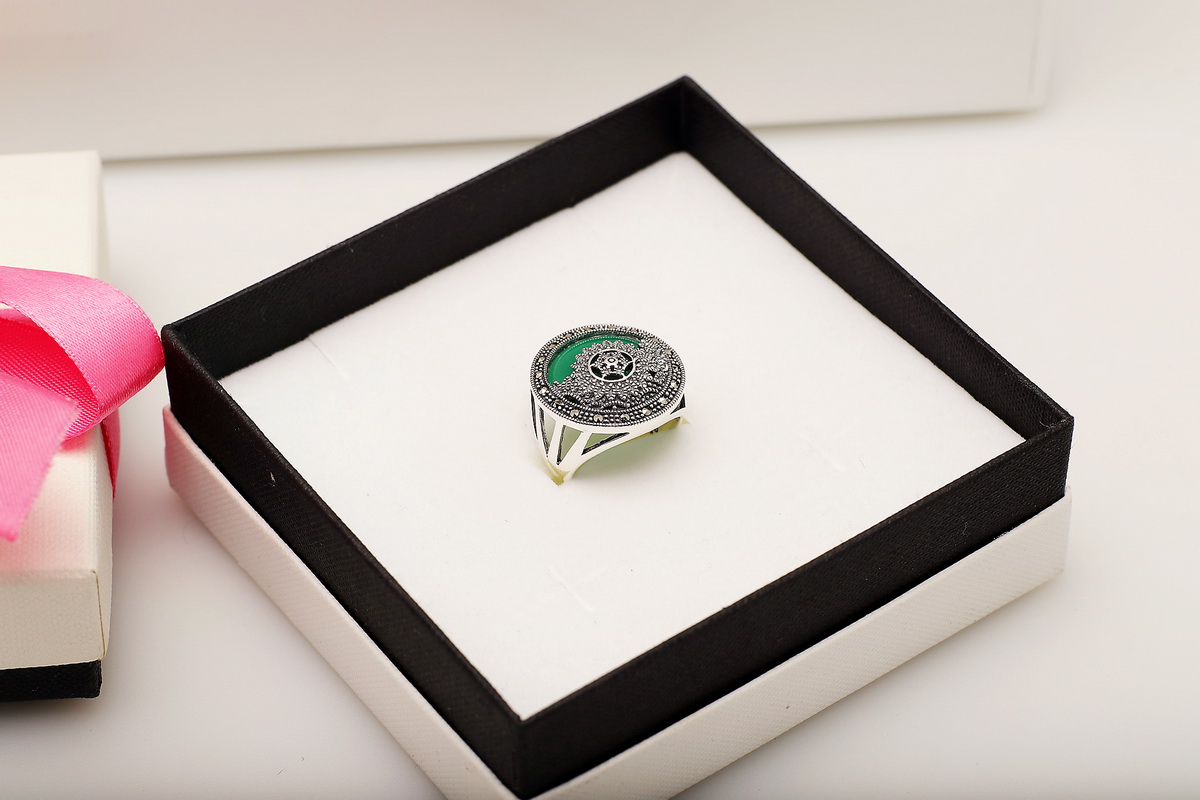 Impressive sterling silver ring made of sterling silver 0.925, decorated with a beautiful, green agate and intricately framed marcasites. Richly decorated, openwork composition in vintage style catches the eye and gives the whole an artistic character. An ideal choice for women who appreciate original and expressive jewellery with a soul.