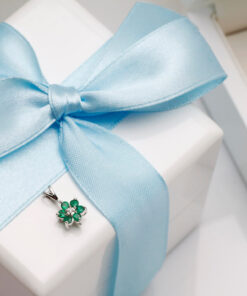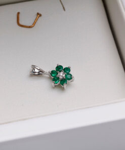 Zachwycający wisiorek w kształcie kwiatka, wykonany z białego złota próby 0,585. W centralnej części lśni diament o szlifie brylantowym, otoczony sześcioma intensywnie zielonymi szmaragdami, które nadają kompozycji wyjątkowej świeżości i elegancji. To biżuteria pełna symboliki natury, idealna na specjalne okazje i jako prezent wyrażający wyjątkowe uczucia.