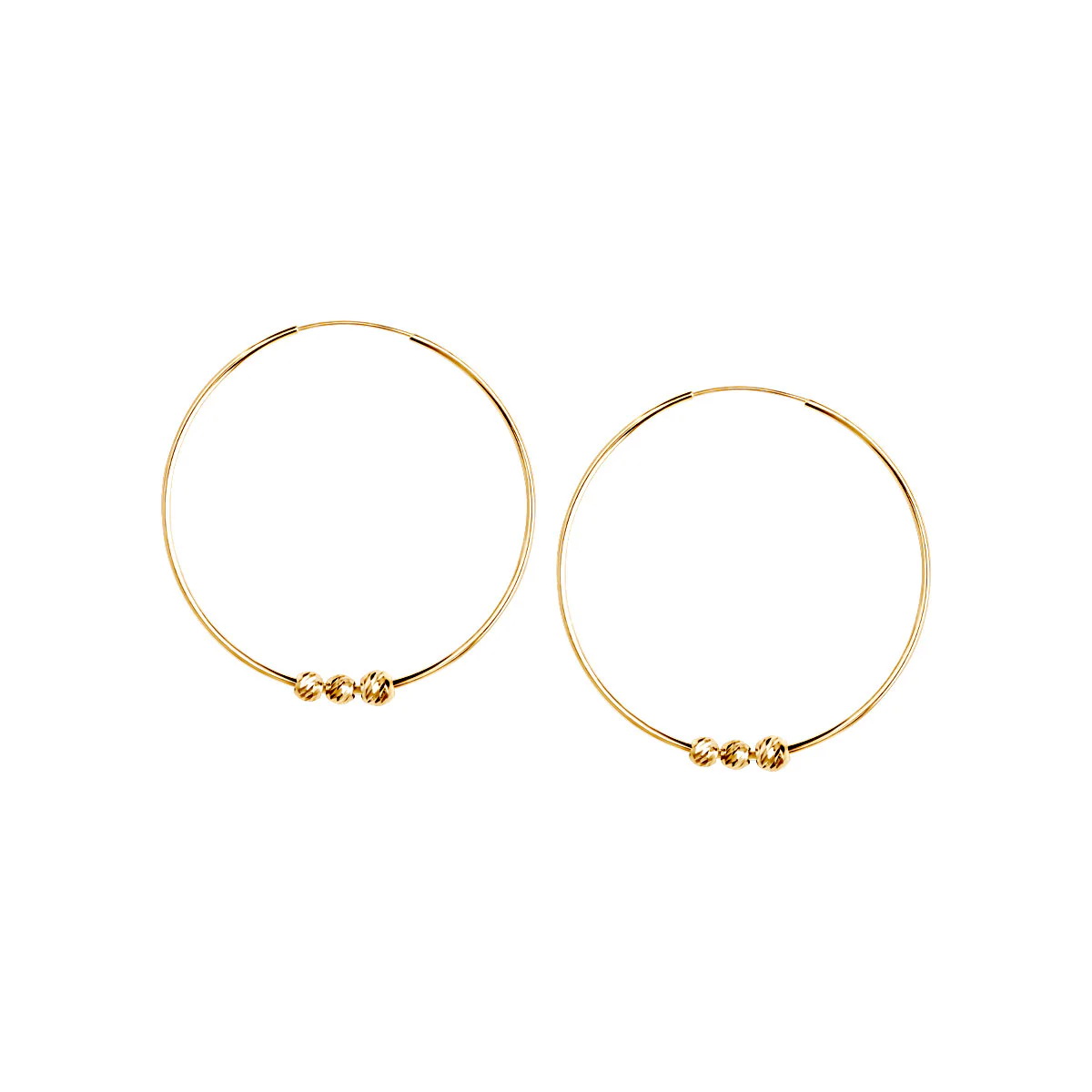 Delicate and stylish hoop earrings made from 0.585 yellow gold are the perfect choice for women who appreciate a classic form with a subtle touch. The round hoops, 30mm in diameter, have been decorated with three tiny decorative balls that add lightness and charm to the whole. Perfect for everyday styling as well as more elegant ensembles.