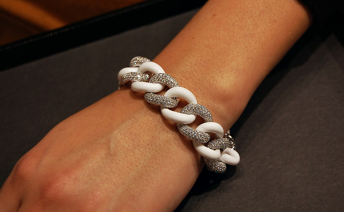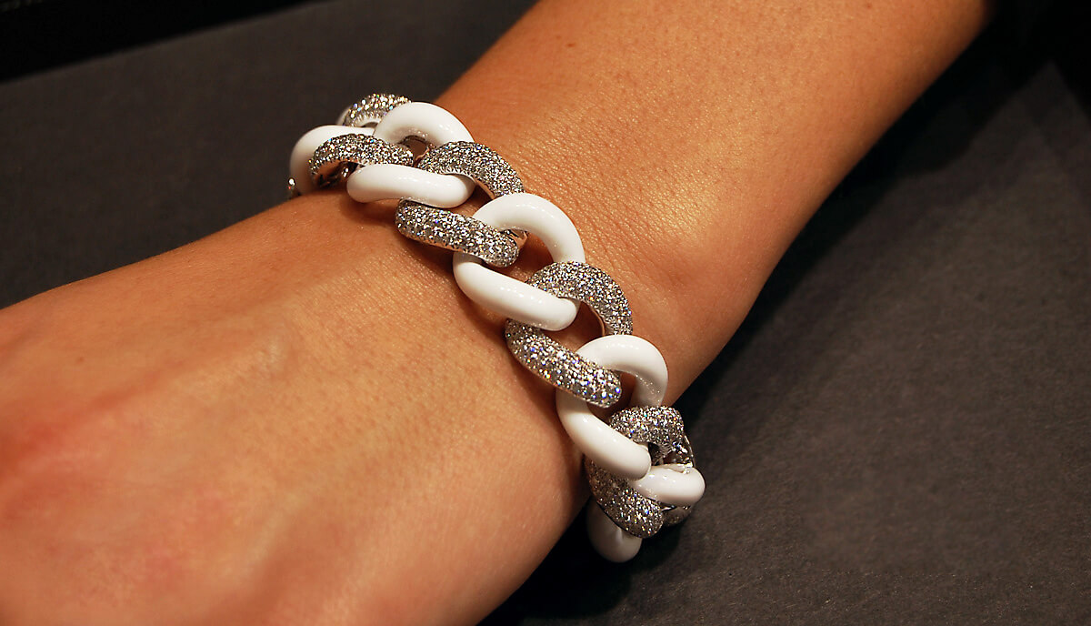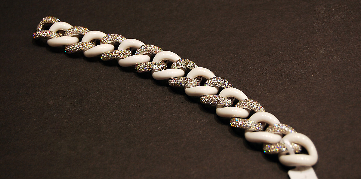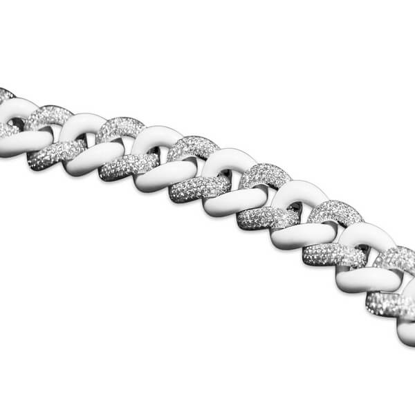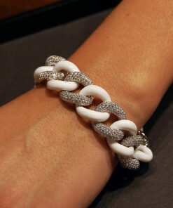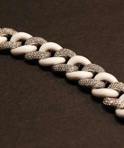 Elegancka bransoleta o długości 18 cm, wykonana z najwyższej jakości 18-karatowego białego złota, stanowi wyrafinowane połączenie szlachetnego białego agatu z oszałamiającym blaskiem 1 234 diamentów o łącznej masie 12,66 ct. Precyzyjnie oszlifowane kamienie w barwach G–H i czystości SI1 tworzą harmonijny, luksusowy akcent na tle delikatnej konstrukcji biżuterii. Szerokość bransolety wynosząca 18,5 mm i grubość 5 mm zapewniają zarówno komfort noszenia, jak i wyjątkową trwałość. To ekskluzywny dodatek, który podkreśli elegancję wieczorowych stylizacji i będzie doskonałym prezentem dla koneserów piękna.
