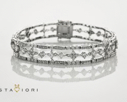 Wyrafinowana bransoleta z 18-karatowego białego złota próby 0,750, skomponowana z misternie połączonych paneli wysadzanych 269 brylantami o łącznej masie 4,66 ct oraz 7 diamentami w szlifie princess o masie 0,63 ct (barwa G–H, czystość SI1). Ażurowa, dwurzędowa konstrukcja tworzy lekki, koronkowy wzór, w którym geometryczne ogniwa z delikatnie lśniącymi princessami przeplatają się z drobnymi brylantami, nadając całości nowoczesnego, a zarazem kobiecego charakteru.