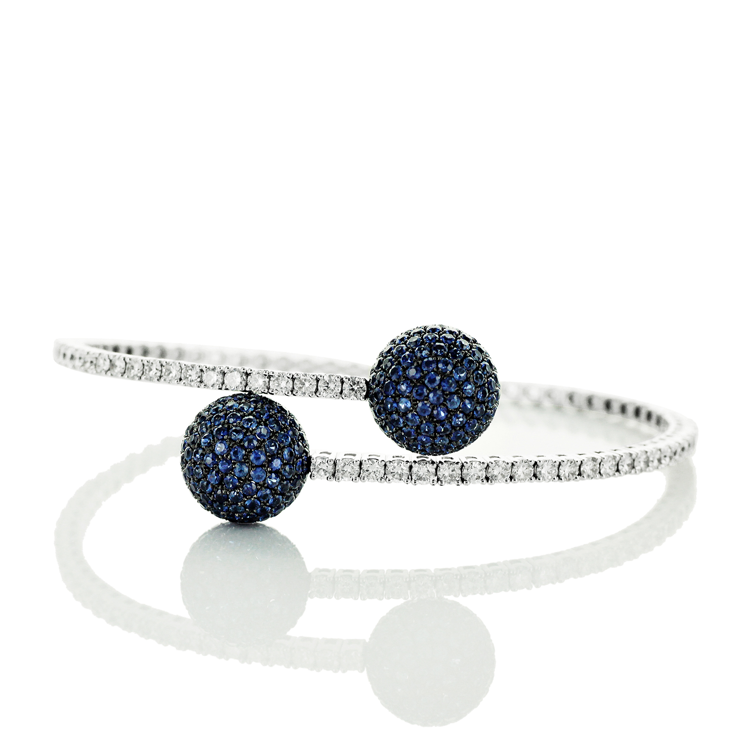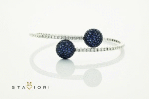 Olśniewająca bransoleta z białego i czarnego złota próby 0,750 to wyjątkowe dzieło sztuki jubilerskiej. Model o nowoczesnym, otwartym kształcie ozdobiony został 50 brylantami o łącznej masie 1,93 ct oraz aż 250 szafirami o masie 3,77 ct, które zdobią dwie kuliste końcówki, przyciągając wzrok głębokim, granatowym blaskiem. Ta elegancka i zmysłowa kompozycja to idealny wybór na szczególne okazje, dla kobiet ceniących niebanalny styl i luksus.