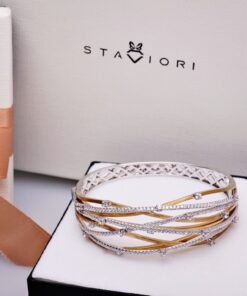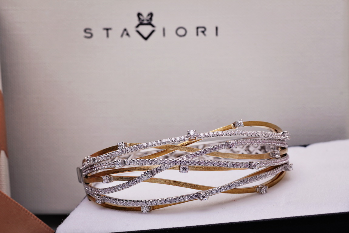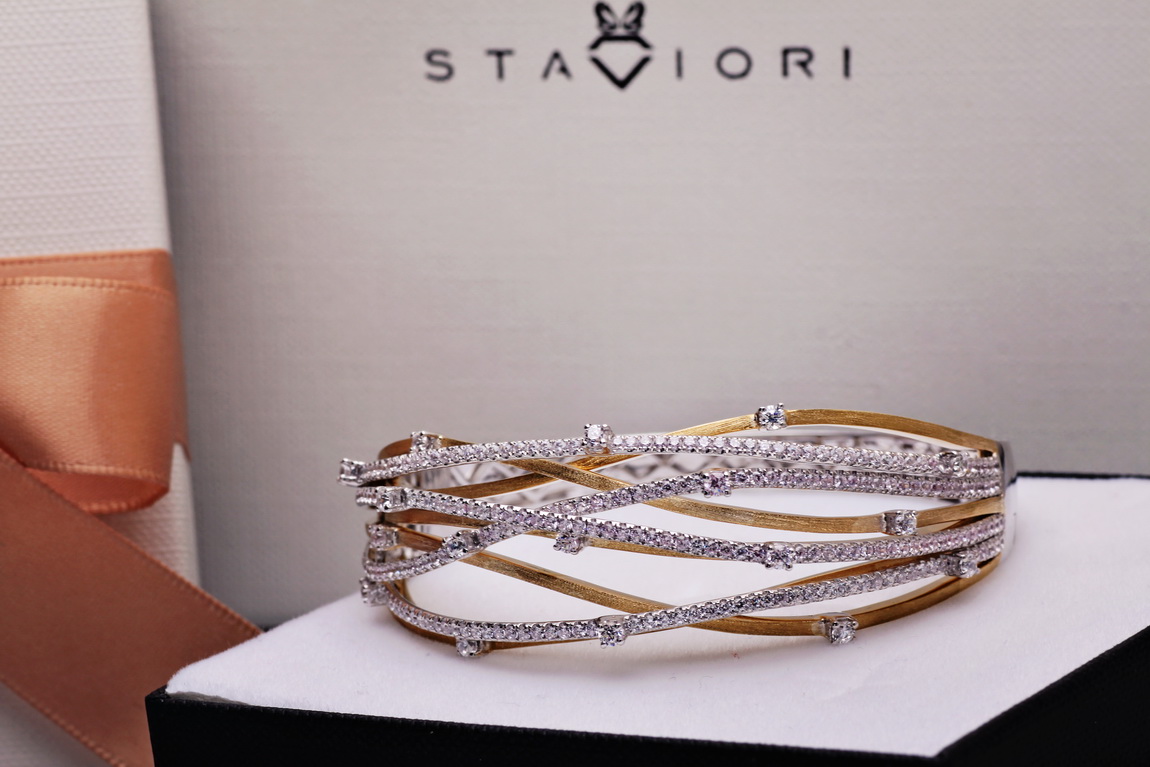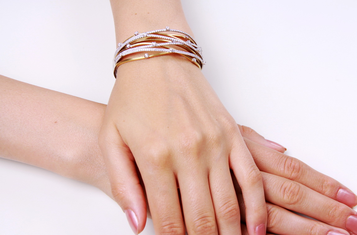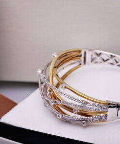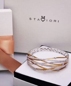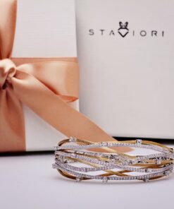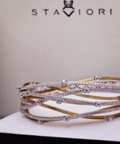 Spektakularna bransoleta wykonana z żółtego i białego złota próby 750, wysadzana aż 270 diamentami o łącznej masie 3,43 ct w szlifie brylantowym. Przeplatające się pasma złota i diamentów tworzą niezwykle efektowną, luksusową kompozycję, która zachwyca blaskiem i elegancją. To wyjątkowa biżuteria, która podkreśli prestiż i doskonały gust swojej właścicielki.