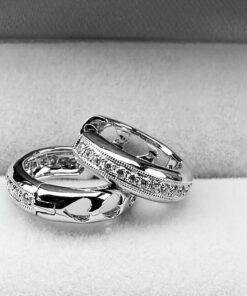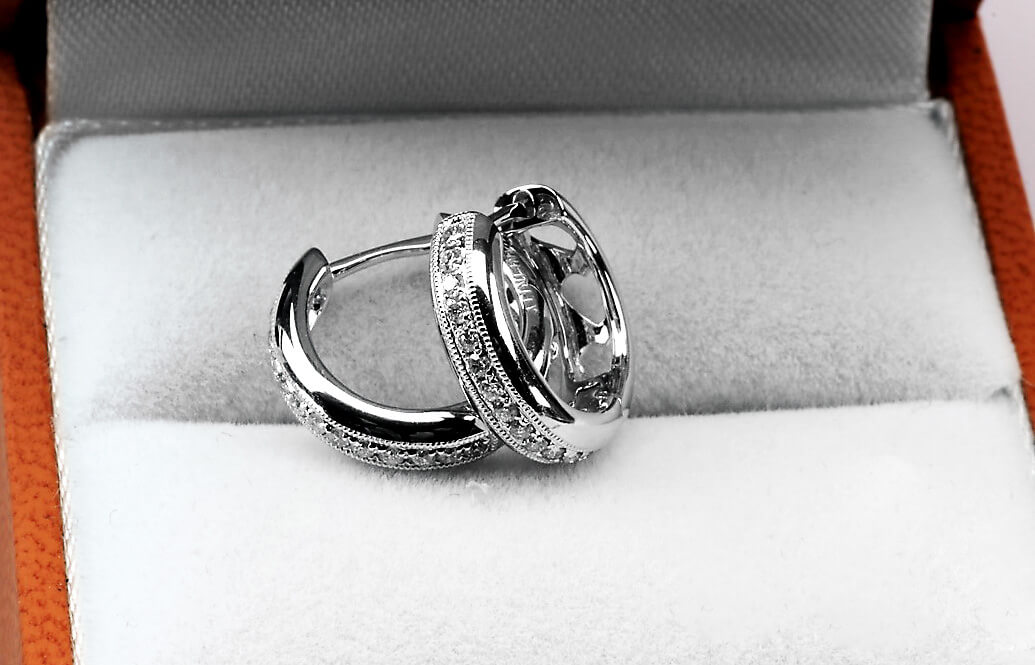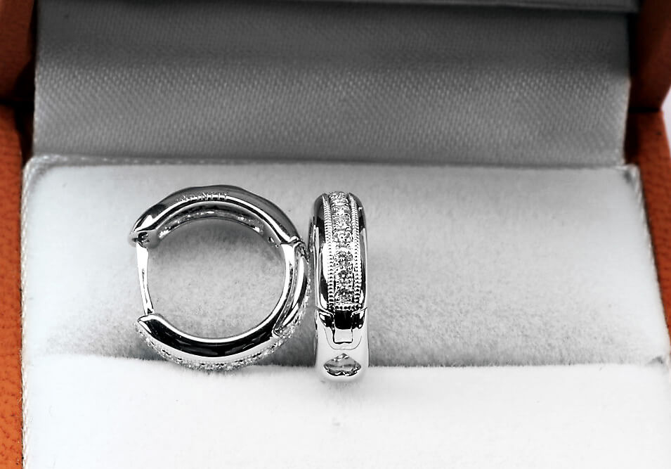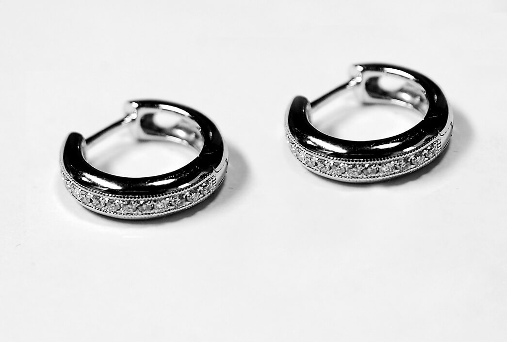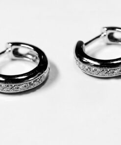 Zachwycające kolczyki z białego złota próby 0,750, ozdobione 28 lśniącymi diamentami o łącznej masie 0,20 ct. Klasyczna forma kółeczek została wzbogacona o precyzyjne zdobienia i subtelną linię brylantów, które dodają im wyjątkowego blasku. Eleganckie i pełne szyku, doskonale sprawdzą się zarówno na co dzień, jak i jako wyrafinowany akcent wieczorowej stylizacji. Ponadczasowy styl w luksusowym wydaniu.