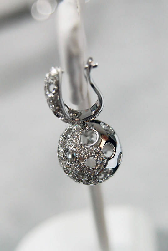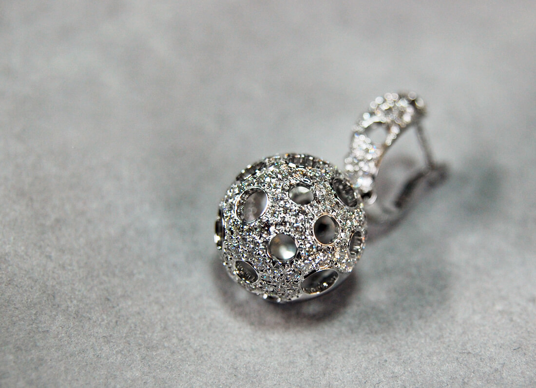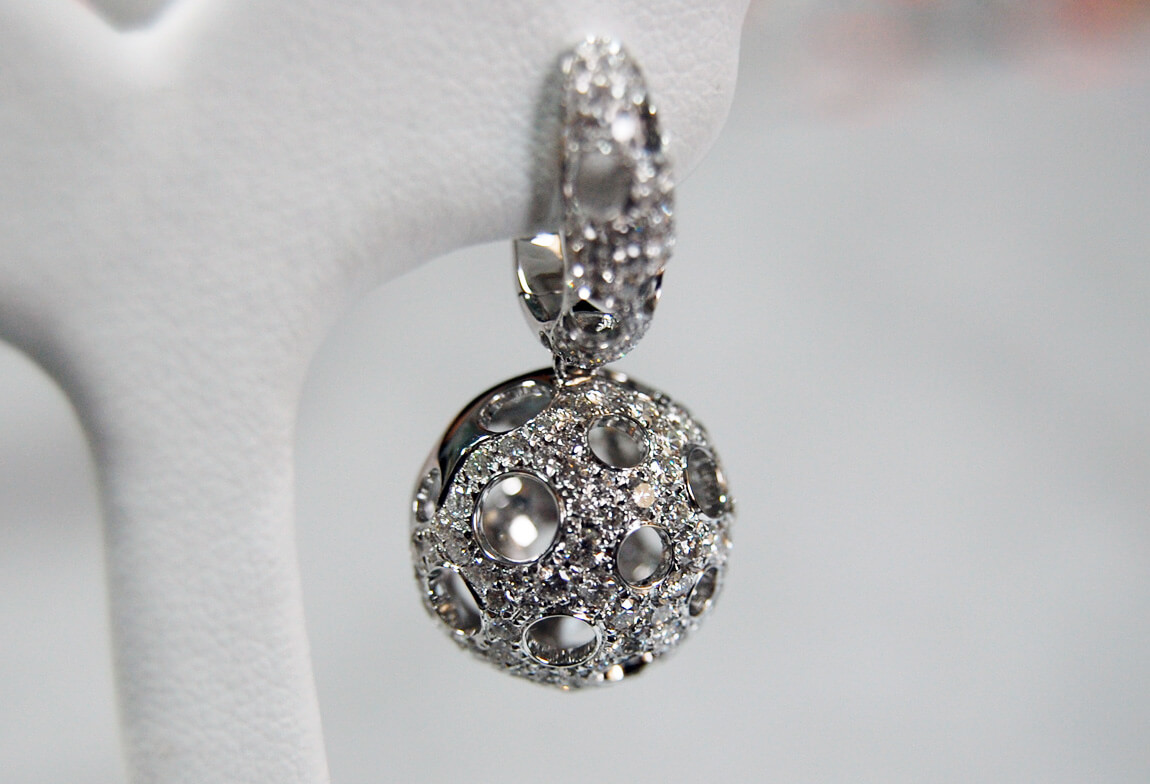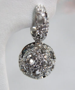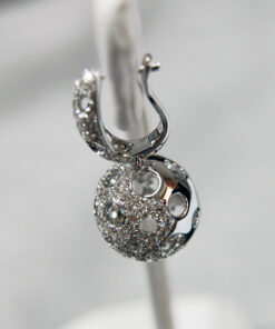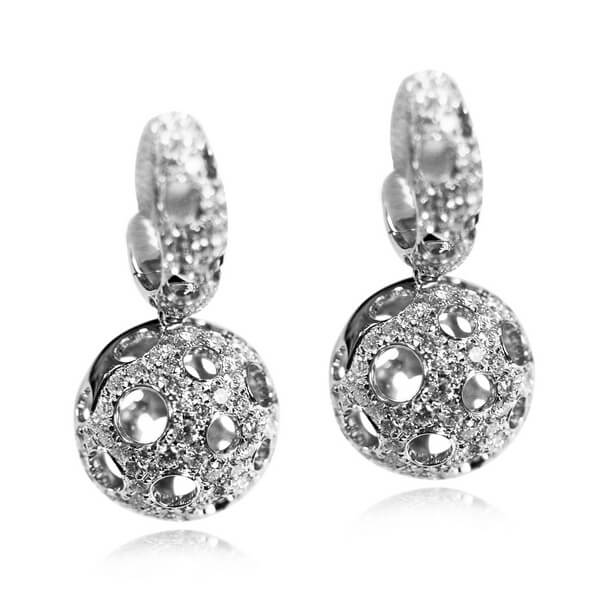 Zachwycające kolczyki z białego złota 18K, które przyciągają uwagę swoją niebanalną formą. Kuliste zawieszki wysadzane są aż 287 diamentami o łącznej masie 2,60ct, tworząc zjawiskowy, błyszczący efekt. Ażurowa struktura dodaje im lekkości i przestrzenności, co sprawia, że biżuteria prezentuje się niezwykle nowocześnie i stylowo. To doskonały wybór dla kobiet ceniących odważny design w eleganckim wydaniu.