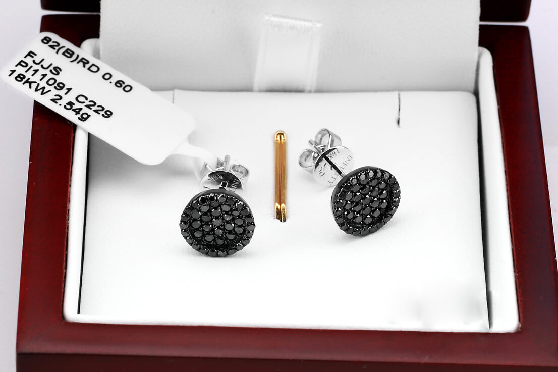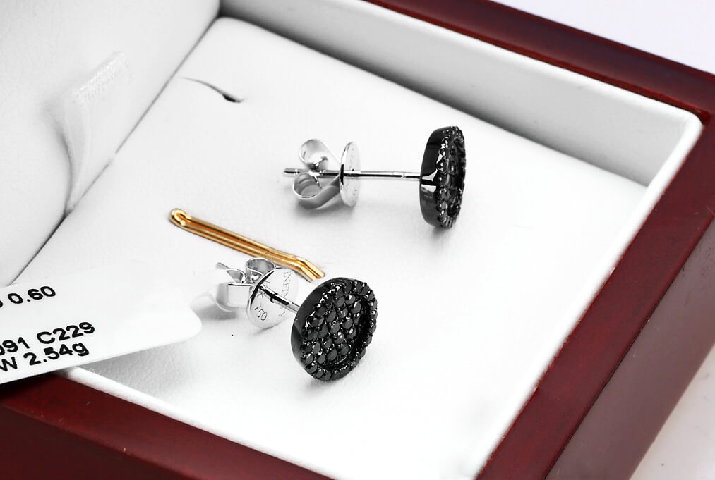 Eleganckie kolczyki wykonane z 18-karatowego złota, ozdobione aż 82 czarnymi diamentami o łącznej masie 0,60 ct. Ich nowoczesna forma oraz hipnotyzujący blask sprawiają, że doskonale podkreślają charakter każdej stylizacji. Idealne dla kobiet ceniących wyrafinowany styl i niebanalną biżuterię. Kolczyki dostępne w różnych odcieniach złota – białym, żółtym, różowym oraz czarnym (czarne złoto to białe złoto pokryte czarnym rodem), co pozwala dopasować je do indywidualnych upodobań.