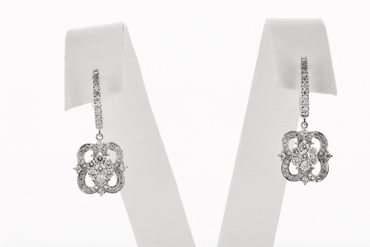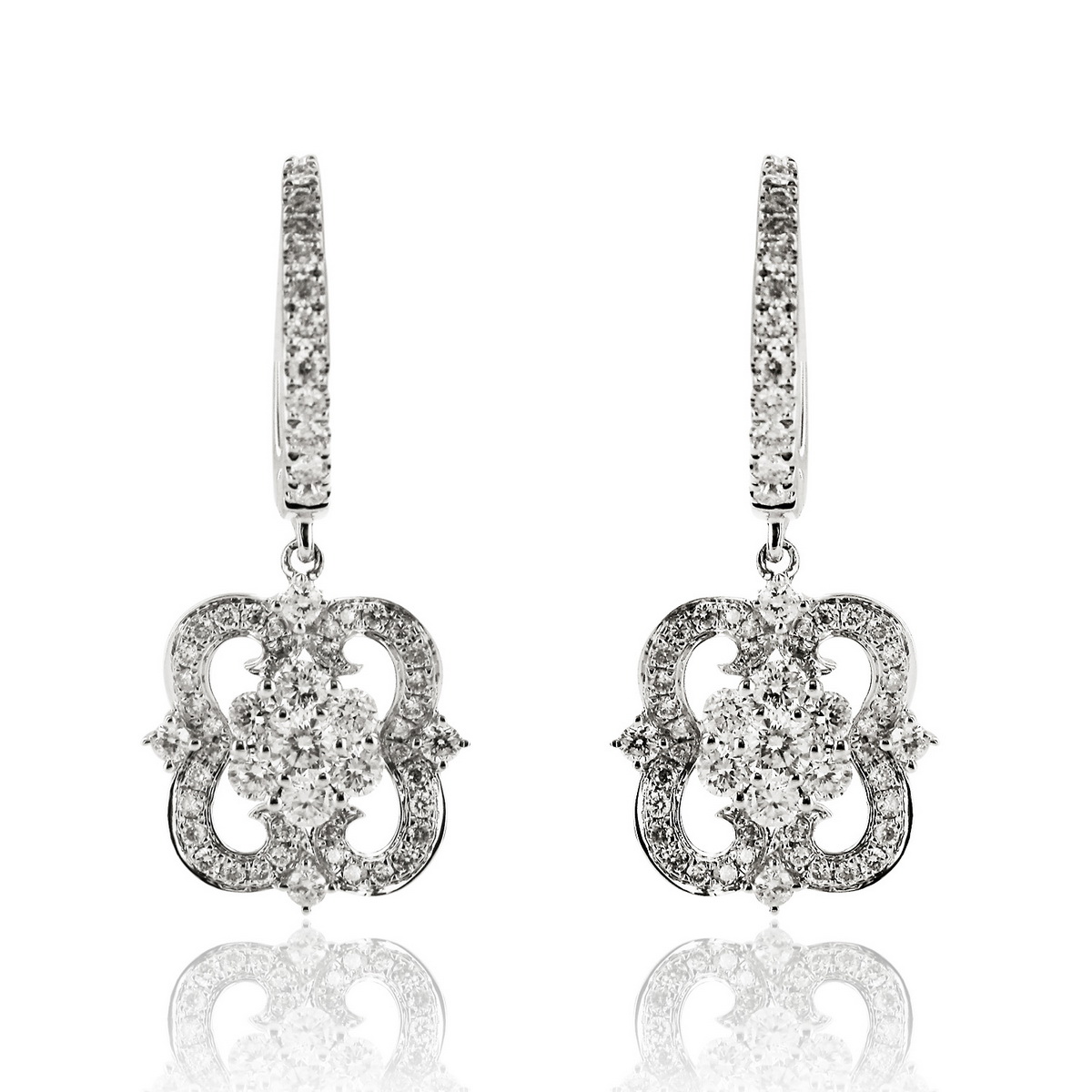 Zjawiskowe kolczyki z białego złota próby 750, ozdobione aż 116 diamentami o łącznej masie 1,14 ct. Delikatny, a zarazem wyrazisty motyw kwiatowo-ornamentalny nadaje im niezwykłego uroku i kobiecej lekkości. Brylanty w wysokiej jakości barwie G-H i czystości SI1 pięknie odbijają światło, tworząc efekt subtelnego, luksusowego blasku. Zapięcie typu klips z bolcem zapewnia wygodę i bezpieczeństwo noszenia. To doskonała propozycja dla kobiet ceniących elegancję i klasykę w nowoczesnej odsłonie.