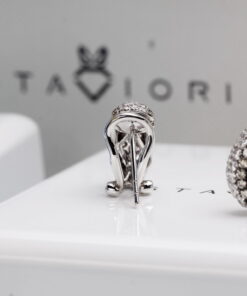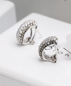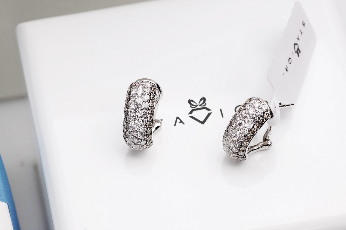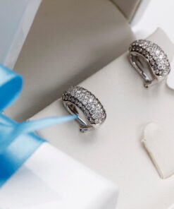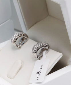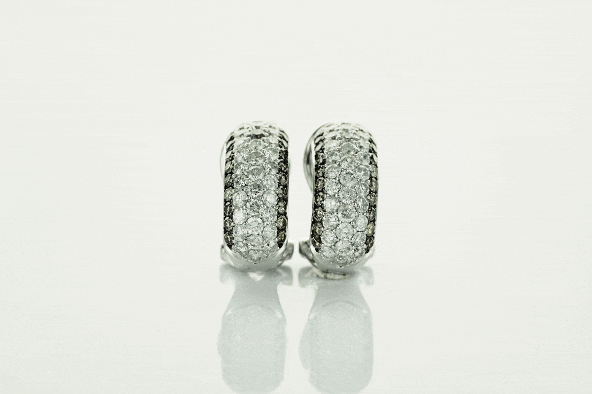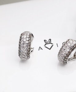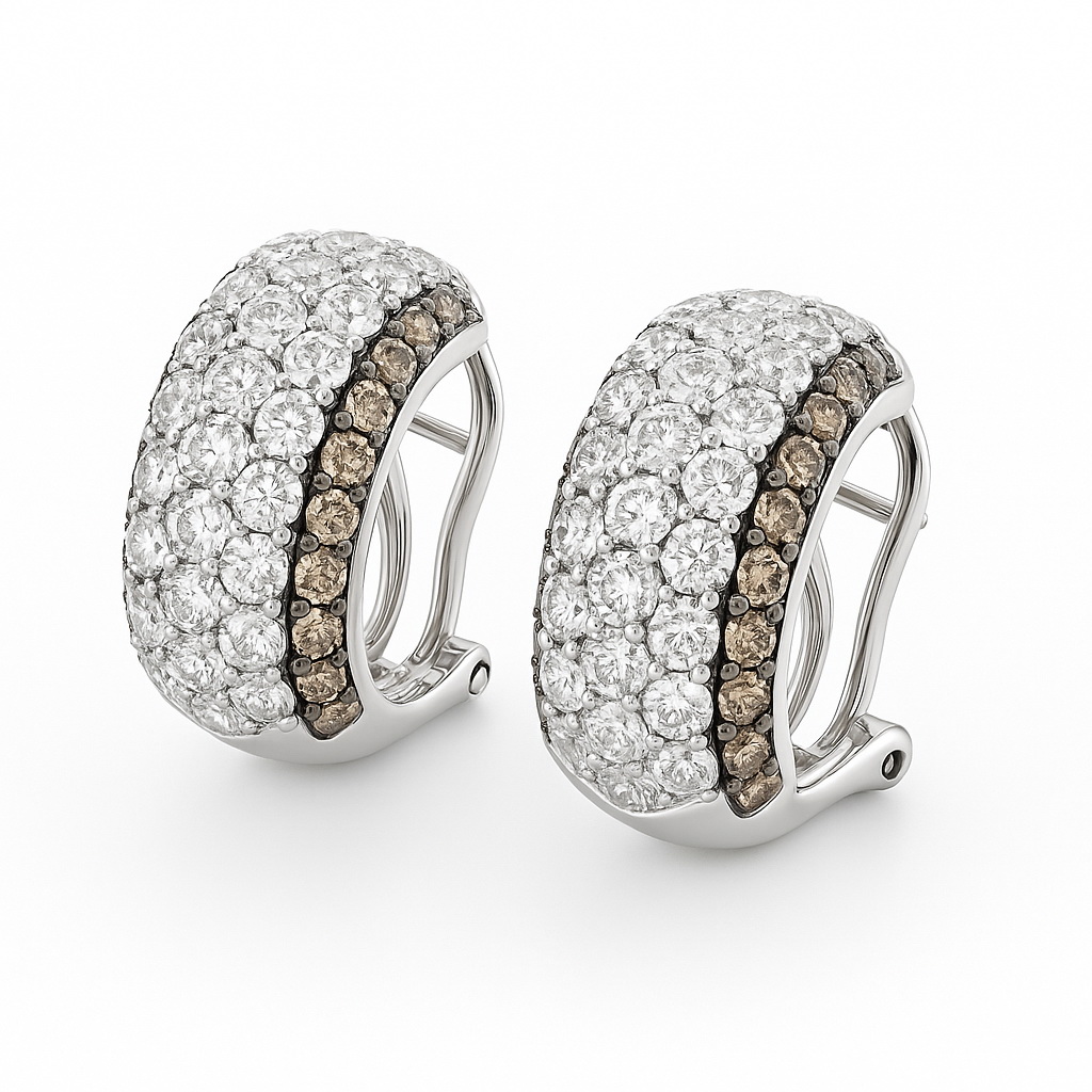 Wyjątkowe kolczyki z białego złota próby 750, wysadzane łącznie 106 diamentami o masie ponad 1,5 ct. 66 brylantów barwy G-H oraz 40 szampańskich diamentów tworzy niezwykłą kompozycję blasku i elegancji. Harmonijna, wypukła forma podkreśla luksusowy charakter biżuterii. Kolczyki wyposażone są w zapięcie typu klips z bolcem, które gwarantuje stabilność, wygodę i bezpieczeństwo noszenia. To wytworny model, doskonały na wyjątkowe okazje.