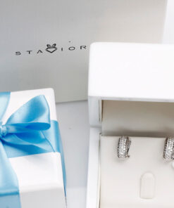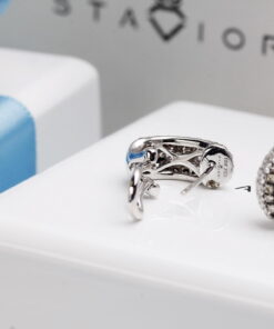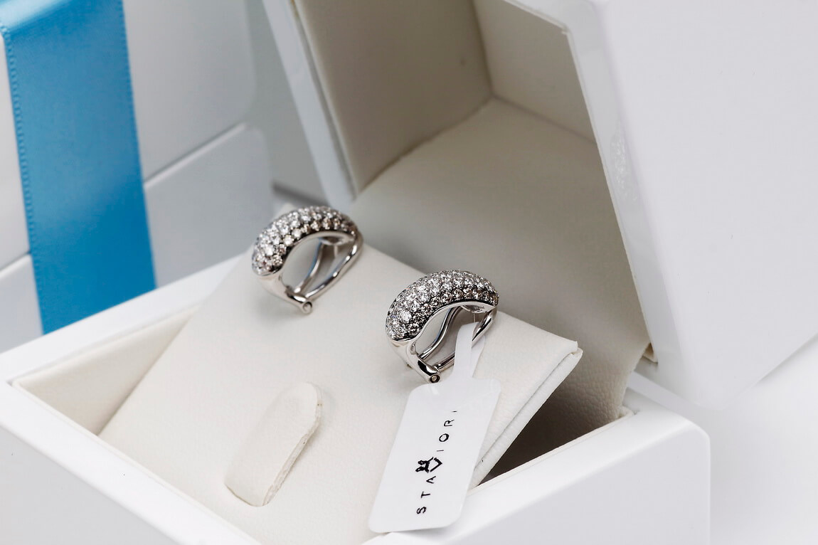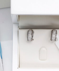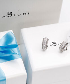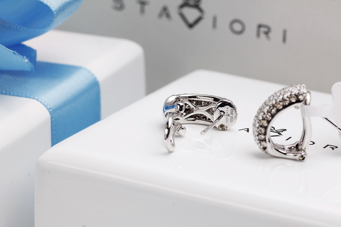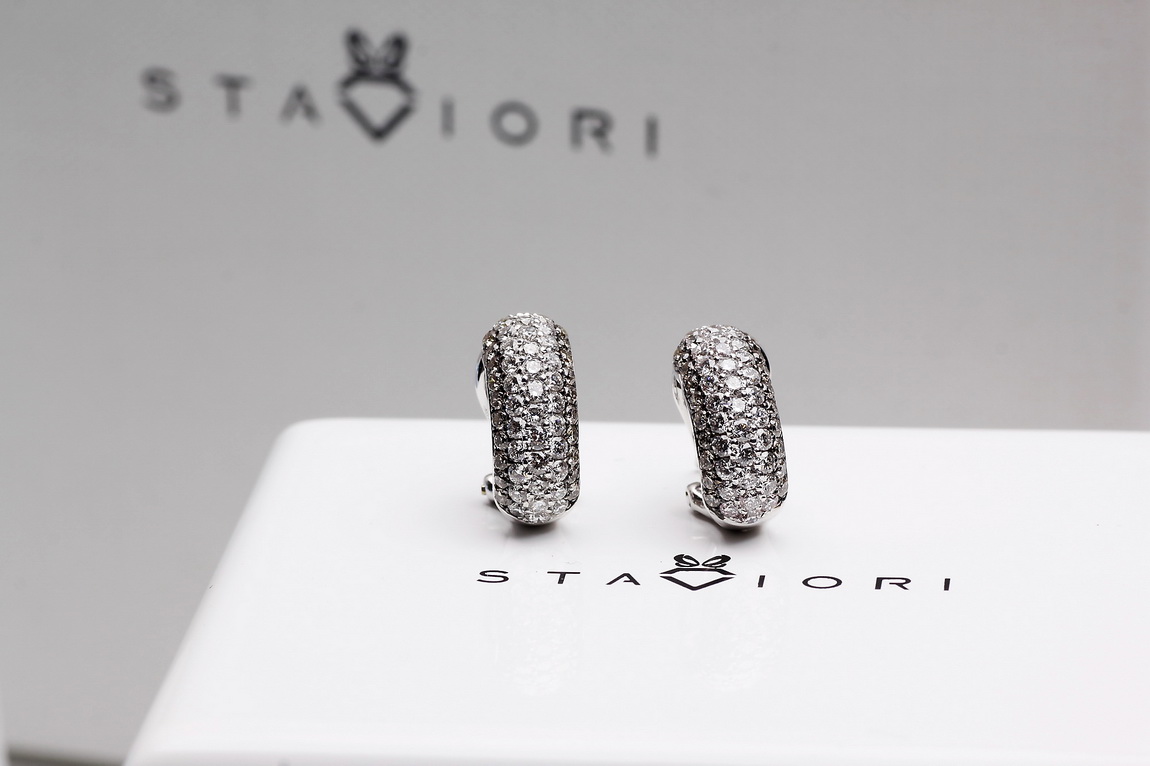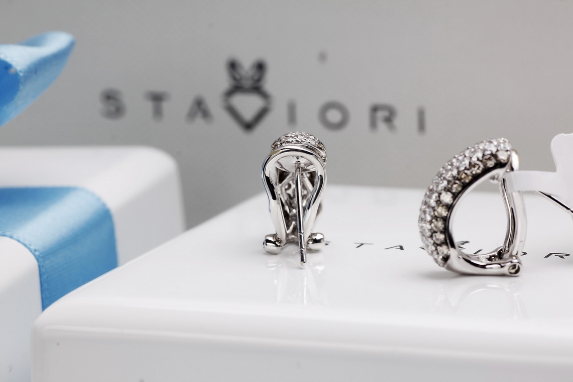 Wyjątkowe kolczyki z białego złota próby 750, wysadzane łącznie 106 diamentami o masie ponad 1,5 ct. 66 brylantów barwy G-H oraz 40 szampańskich diamentów tworzy niezwykłą kompozycję blasku i elegancji. Harmonijna, wypukła forma podkreśla luksusowy charakter biżuterii. Kolczyki wyposażone są w zapięcie typu klips z bolcem, które gwarantuje stabilność, wygodę i bezpieczeństwo noszenia. To wytworny model, doskonały na wyjątkowe okazje.