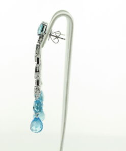 Eleganckie kolczyki z białego złota próby 0.750 olśniewają harmonią błękitnych topazów i lśniących brylantów. Ażurowa forma z delikatnymi łańcuszkami nadaje im lekkości i wyjątkowego wdzięku. 76 diamentów subtelnie rozświetla całość, podkreślając luksusowy charakter tej biżuterii. Idealne na wyjątkowe okazje — dla kobiet, które cenią wyrafinowany styl i niebanalny blask.