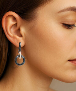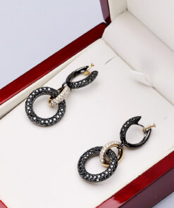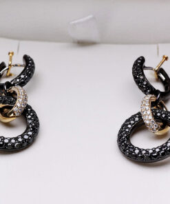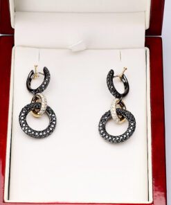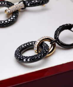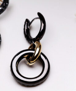 Zjawiskowe kolczyki wykonane z 18-karatowego złota w kontrastującym zestawieniu żółtego i czarnego wykończenia, które przyciąga uwagę i zachwyca oryginalnością. Luksusowy design oparty na motywie trzech połączonych pierścieni, z których każdy został bogato wysadzany brylantami – w klasycznej, białej barwie oraz głębokiej czerni. Aż 268 kamieni o łącznej masie niemal 3 ct tworzy wyjątkowy efekt blasku i głębi. Kolczyki stanowią doskonały wybór dla kobiet, które lubią wyrazistą biżuterię i bezkompromisowy styl.