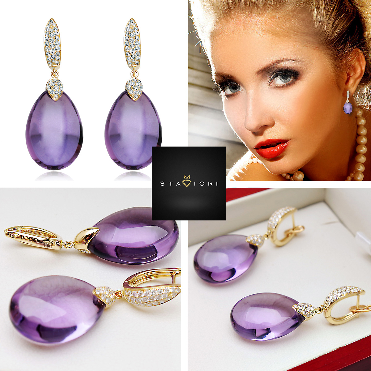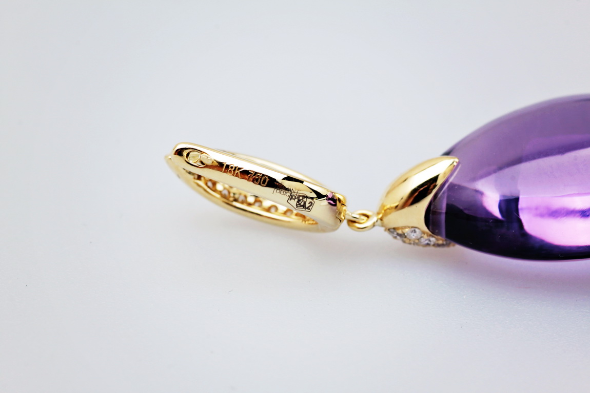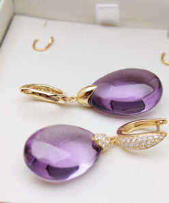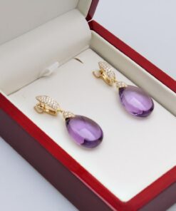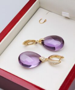 Luksusowe kolczyki wykonane z najwyższej jakości żółtego złota próby 0,750. W centrum kompozycji króluje imponujący, fasetowany ametyst w kształcie kropli o masie niemal 25 ct, który zachwyca swoją intensywną fioletową barwą. Górna część kolczyków pokryta jest aż 78 lśniącymi brylantami, co dodaje całości niepowtarzalnego blasku i ekskluzywnego charakteru. To idealna propozycja na wieczorne wyjścia, galę lub jako spektakularny prezent.