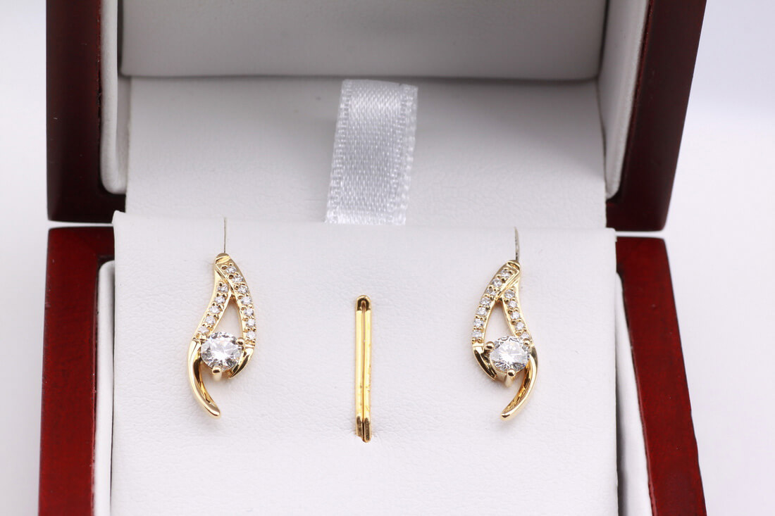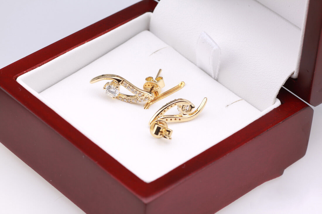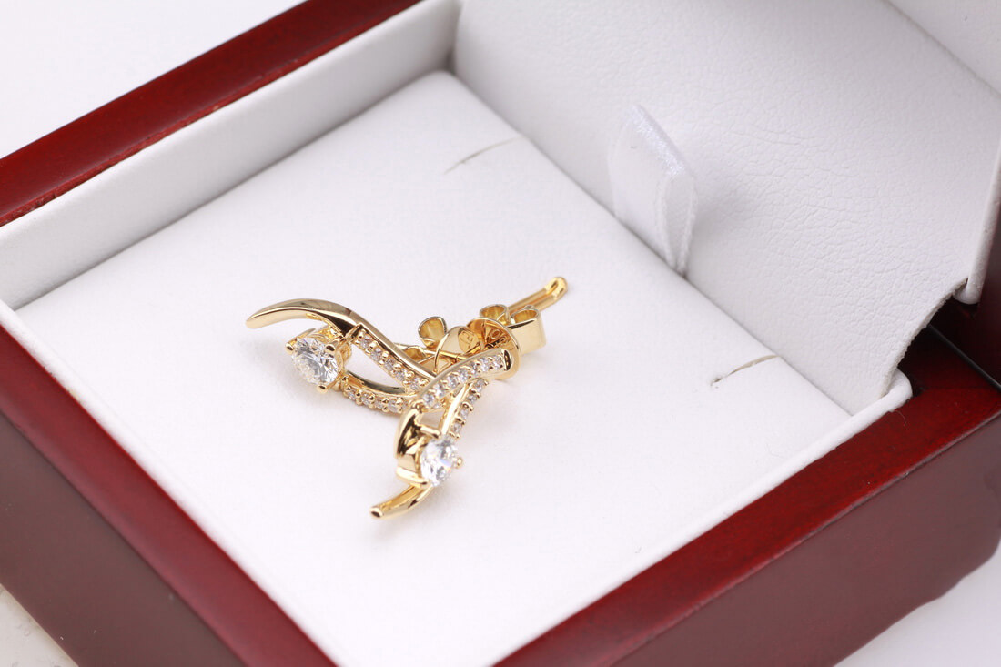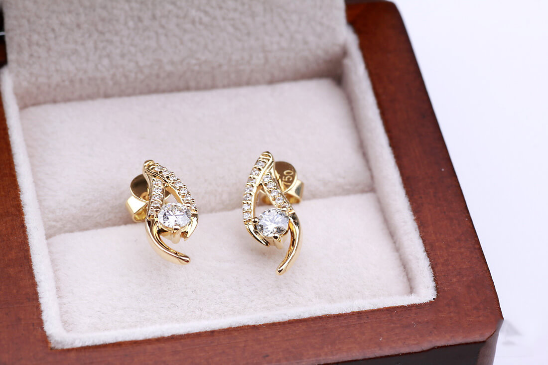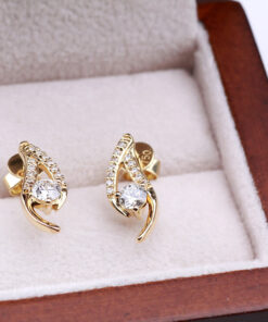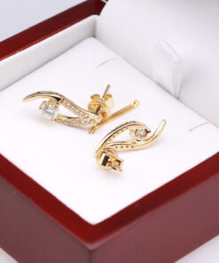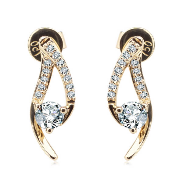 Olśniewające kolczyki z żółtego złota próby 0,750 to wyrafinowana forma luksusu. W centralnym punkcie kompozycji znajdują się dwa większe diamenty o łącznej masie 0,38 ct, otoczone subtelną linią aż 24 mniejszych brylantów. Ich dynamiczny, elegancki kształt przyciąga wzrok i emanuje ponadczasową klasą. To biżuteria stworzona z myślą o kobietach, które kochają blask i niebanalny styl.