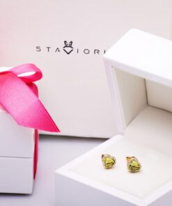Zachwycające kolczyki z żółtego złota próby 0,750, które łączą w sobie romantyzm i luksusowy blask. Centralnym punktem są sercowate perydoty o intensywnie zielonej barwie, których łączna masa to 2,23 ct. Kamienie otacza subtelny wianek z 48 diamentów o łącznej masie 0,14 ct, które dodają kolczykom elegancji i świetlistości. Delikatna forma i wyjątkowy szlif kamieni sprawiają, że kolczyki prezentują się niezwykle efektownie na uchu. Idealne jako prezent dla osoby bliskiej sercu.