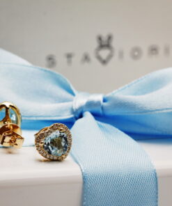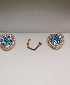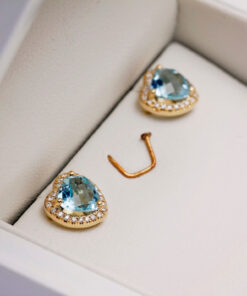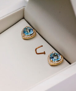 Zachwycające kolczyki z żółtego złota, które olśniewają sercowymi topazami błękitnymi, otoczonymi subtelnym blaskiem 48 diamentów. Wyjątkowe połączenie klasyki i nowoczesności sprawia, że są idealnym wyborem dla kobiet ceniących niebanalną elegancję. Kolczyki w kształcie serca przyciągają uwagę swoim unikatowym wzorem i szlachetnym połyskiem, podkreślając urodę każdej stylizacji. To prawdziwa biżuteryjna perełka, która sprawi, że każda chwila stanie się wyjątkowa.