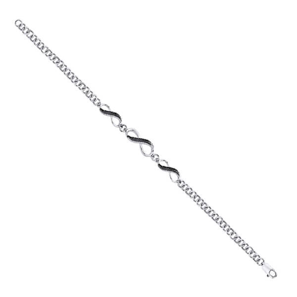 Subtelna bransoleta o długości 18 cm, wykonana z 14-karatowego białego złota próby 0,585. Smukłe kształty nieskończoności ozdobiono 46 czarnymi diamentami w szlifie brylantowym o łącznej masie 0,18ct. Geometryczne ogniwa o wymiarach 9×70 mm nadają całości nowoczesny, minimalistyczny charakter. Idealna dla osób ceniących nieoczywiste akcenty i wyraziste połączenia kolorystyczne.
