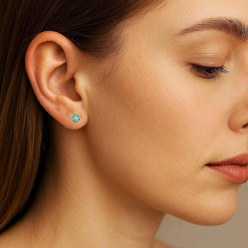 Zjawiskowe kolczyki w kształcie kwiatków wykonane z żółtego złota próby 0,585, które urzekają świeżością i kolorem. Każdy z nich zdobi sześć soczyście zielonych szmaragdów tworzących płatki, a ich centrum rozświetla drobny brylantowy diament. Ta subtelna, a zarazem pełna charakteru kompozycja sprawdzi się zarówno na co dzień, jak i przy wyjątkowych okazjach. Idealna propozycja dla kobiet, które cenią naturalną elegancję i wyrafinowany styl.