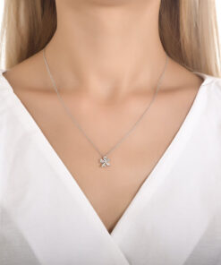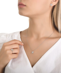 Wyjątkowy naszyjnik z białego złota próby 0,750 z kompozycją lśniących diamentów o różnych szlifach – markiza, gruszka i brylantowy. Subtelna forma kwiatu zachwyca blaskiem oraz perfekcyjnym połączeniem kształtów i kolorów, tworząc niezwykle efektowną ozdobę na dekolcie. Idealny wybór zarówno na co dzień, jak i na eleganckie wyjścia. Istnieje możliwość wykonania naszyjnika w innym kolorze złota.