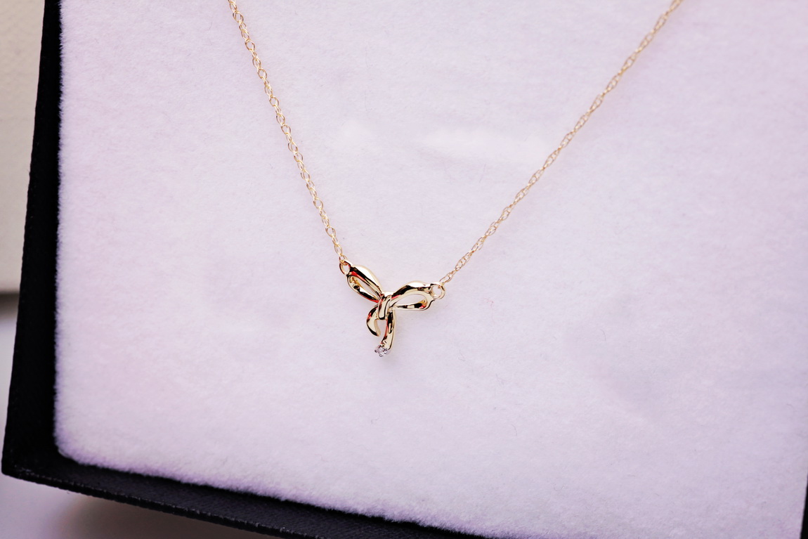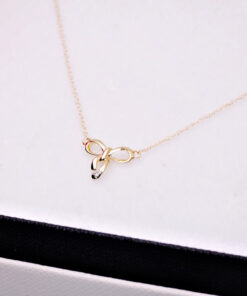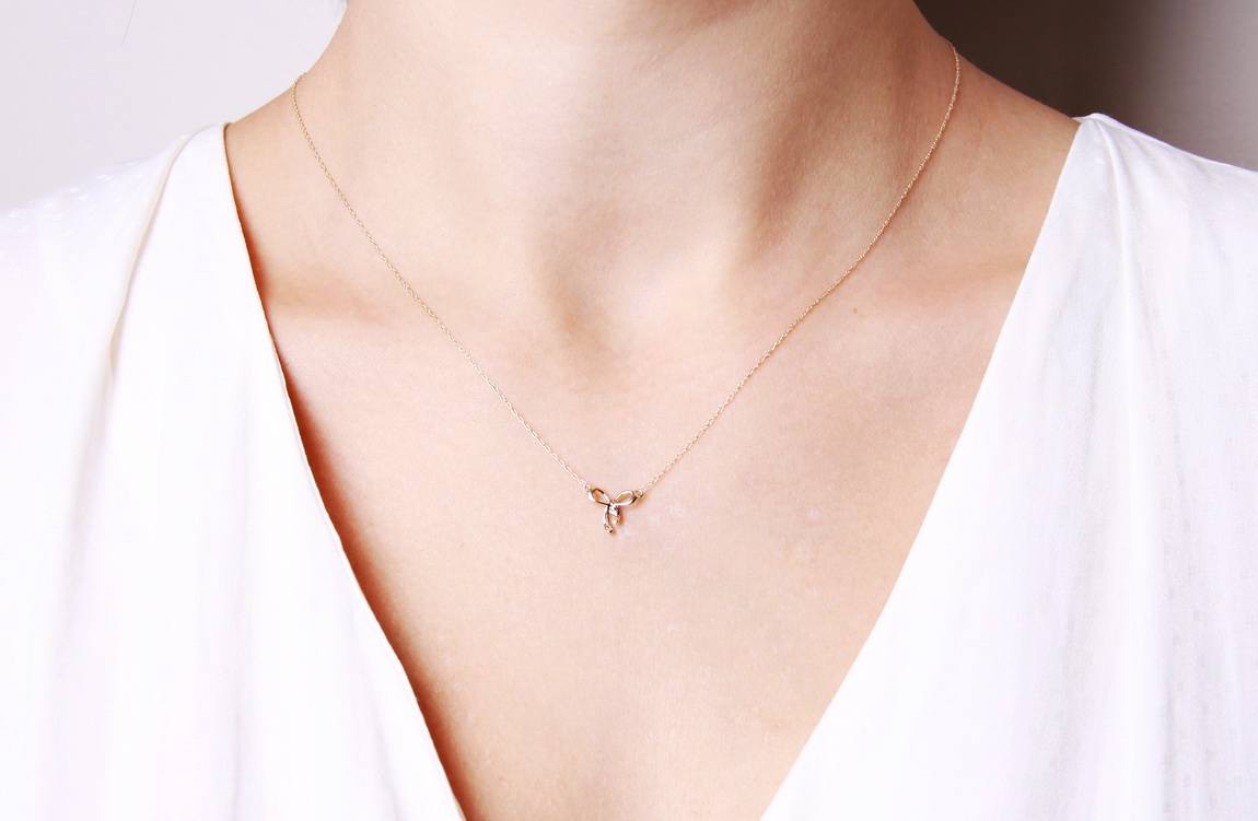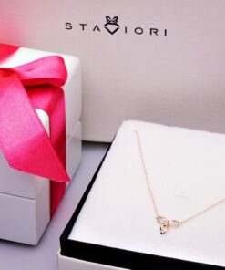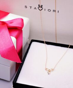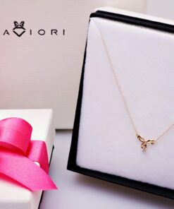 Uroczy naszyjnik z żółtego złota próby 0,585, którego zawieszka w kształcie subtelnej kokardki zachwyca lekkością i wdziękiem. Delikatny brylantowy diament dodaje blasku i podkreśla wyjątkowy charakter biżuterii. To propozycja stworzona dla kobiet, które lubią łączyć dziewczęcy urok z ponadczasową elegancją. Idealny jako prezent lub do codziennych stylizacji.