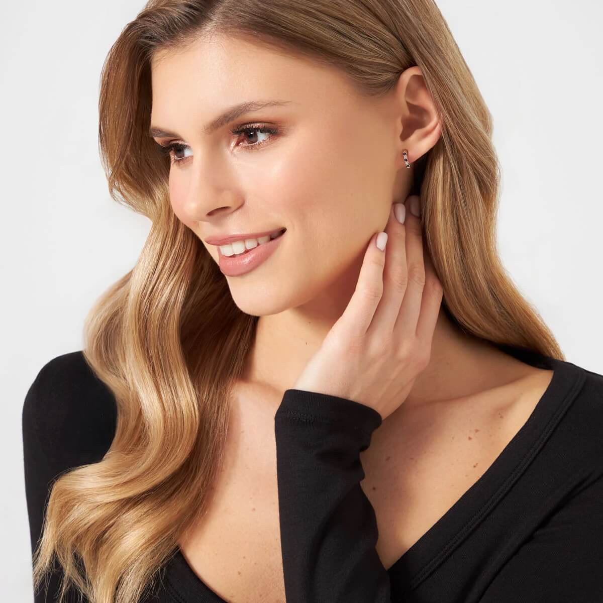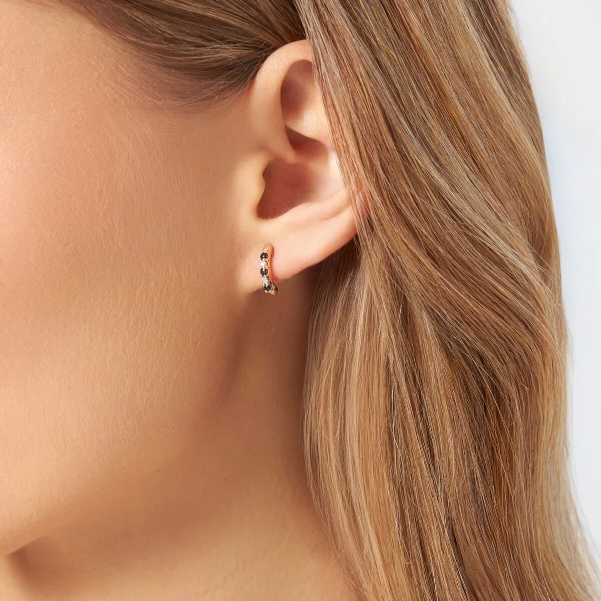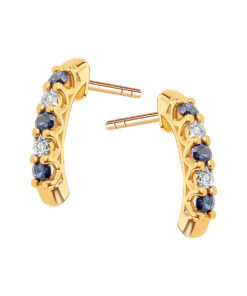 Wyjątkowe kolczyki wykonane z żółtego złota próby 333, które przyciągają wzrok wyrazistym, naprzemiennym układem kamieni. Kompozycja sześciu głębokich szafirów o masie 0,24 ct oraz czterech lśniących diamentów tworzy efektowny pas pełen blasku i koloru. Klasyczna forma sztyftu w połączeniu z lekko zakrzywioną linią kolczyka sprawia, że biżuteria pięknie układa się na uchu, podkreślając urodę właścicielki. To idealny dodatek dla kobiet poszukujących biżuterii z charakterem, która łączy królewski błękit szafirów z szlachetnością złota.