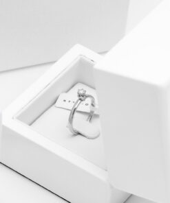 Klasyczny pierścionek zaręczynowy z białego złota próby 0,585, którego sercem jest olśniewający brylant o masie 0,15 ct. Kamień oprawiony jest w delikatną, a zarazem efektowną koronę na sześć łapek, subtelnie unoszącą diament i eksponującą jego blask z każdej strony. Elegancka forma i doskonałe proporcje sprawiają, że ten model to kwintesencja ponadczasowego piękna i romantyzmu. Idealny wybór na oświadczyny.