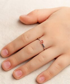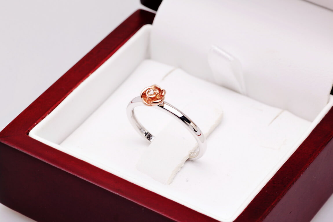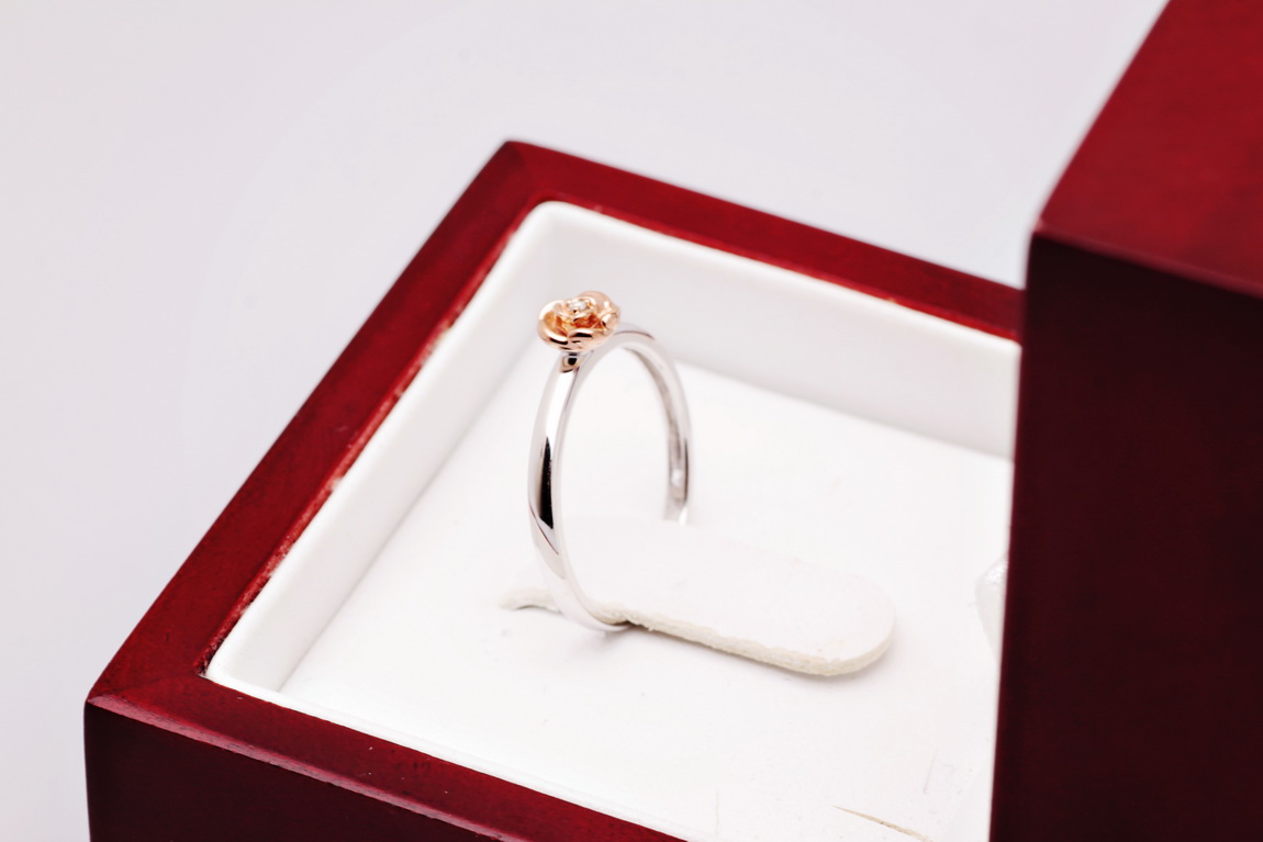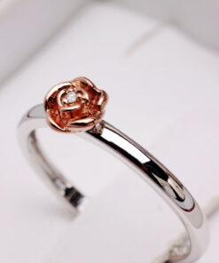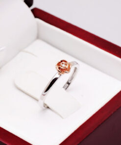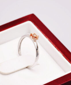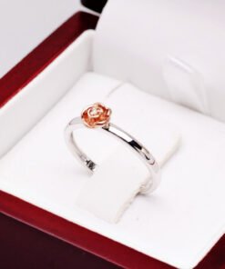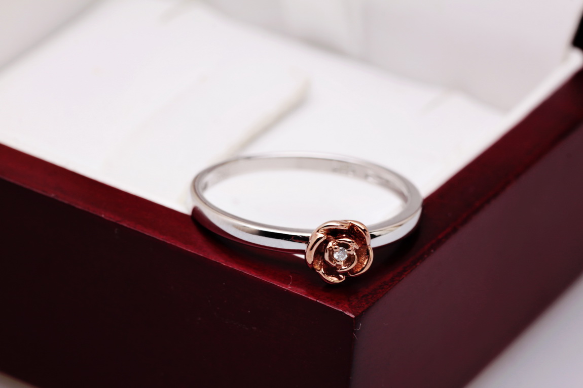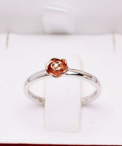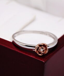 Uroczy pierścionek z białego złota próby 0,585, który zachwyca delikatnością i subtelnym wdziękiem. Centralnym punktem jest maleńka róża pokryta różowym złotem, w której sercu lśni drobny diament w szlifie brylantowym. Symbolika kwiatu miłości i blask szlachetnego kamienia czynią ten model wyjątkowym wyborem dla romantycznych dusz. Idealny jako prezent z serca – pełen uroku i emocji.