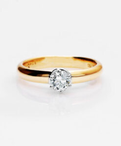 Klasyczny pierścionek zaręczynowy wykonany z 18-karatowego żółtego i białego złota zachwyca ponadczasową formą i elegancją. Centralnie osadzony brylant o masie 0,25ct przyciąga wzrok swoim wyjątkowym blaskiem, a sześcioramienna korona podkreśla jego urok i jakość. Połączenie wysokiej próby złota i perfekcyjnie oszlifowanego kamienia czyni ten model idealnym wyborem na zaręczyny – symbol trwałej miłości i wyjątkowego uczucia.