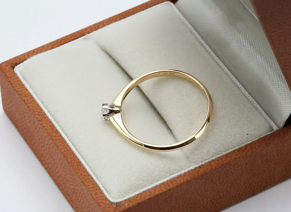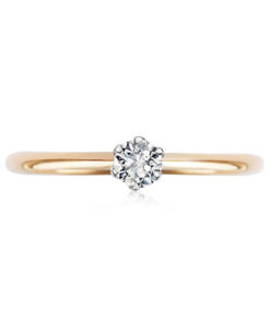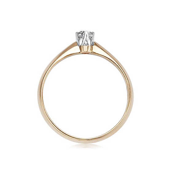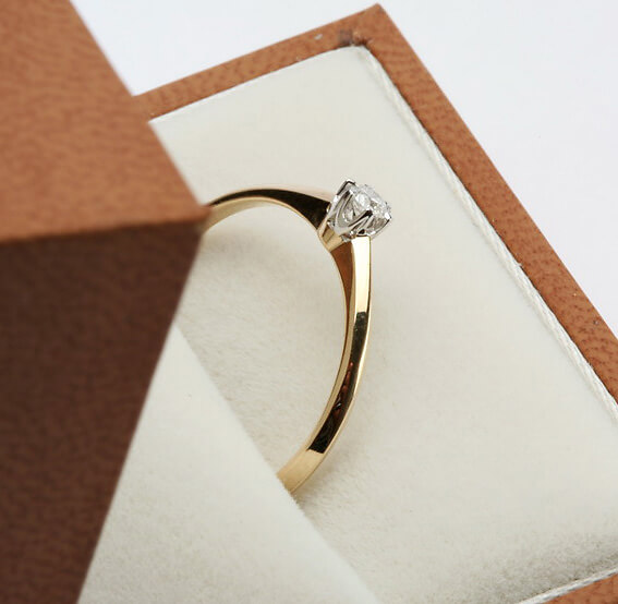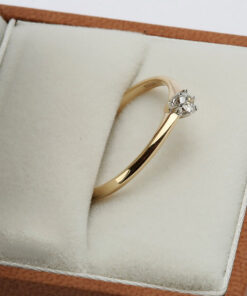 Subtelny pierścionek zaręczynowy wykonany z połączenia żółtego i białego złota próby 0,585. Zwieńczony lśniącym diamentem o masie 0,10 ct w klasycznym sześciokrapowym oprawieniu, przyciąga spojrzenia ponadczasowym wdziękiem. Delikatna forma i elegancki blask czynią go idealnym wyborem na wyjątkowy moment zaręczyn.