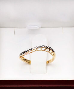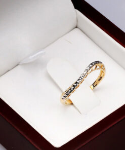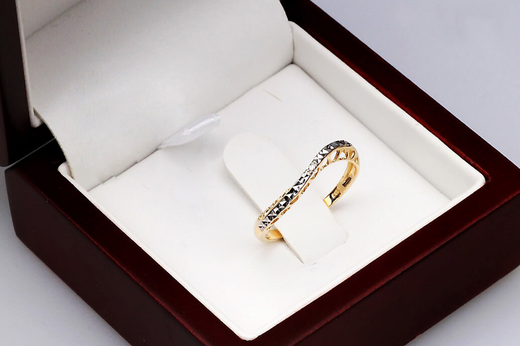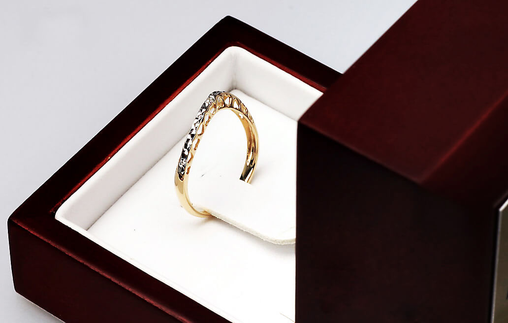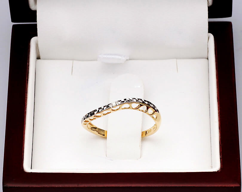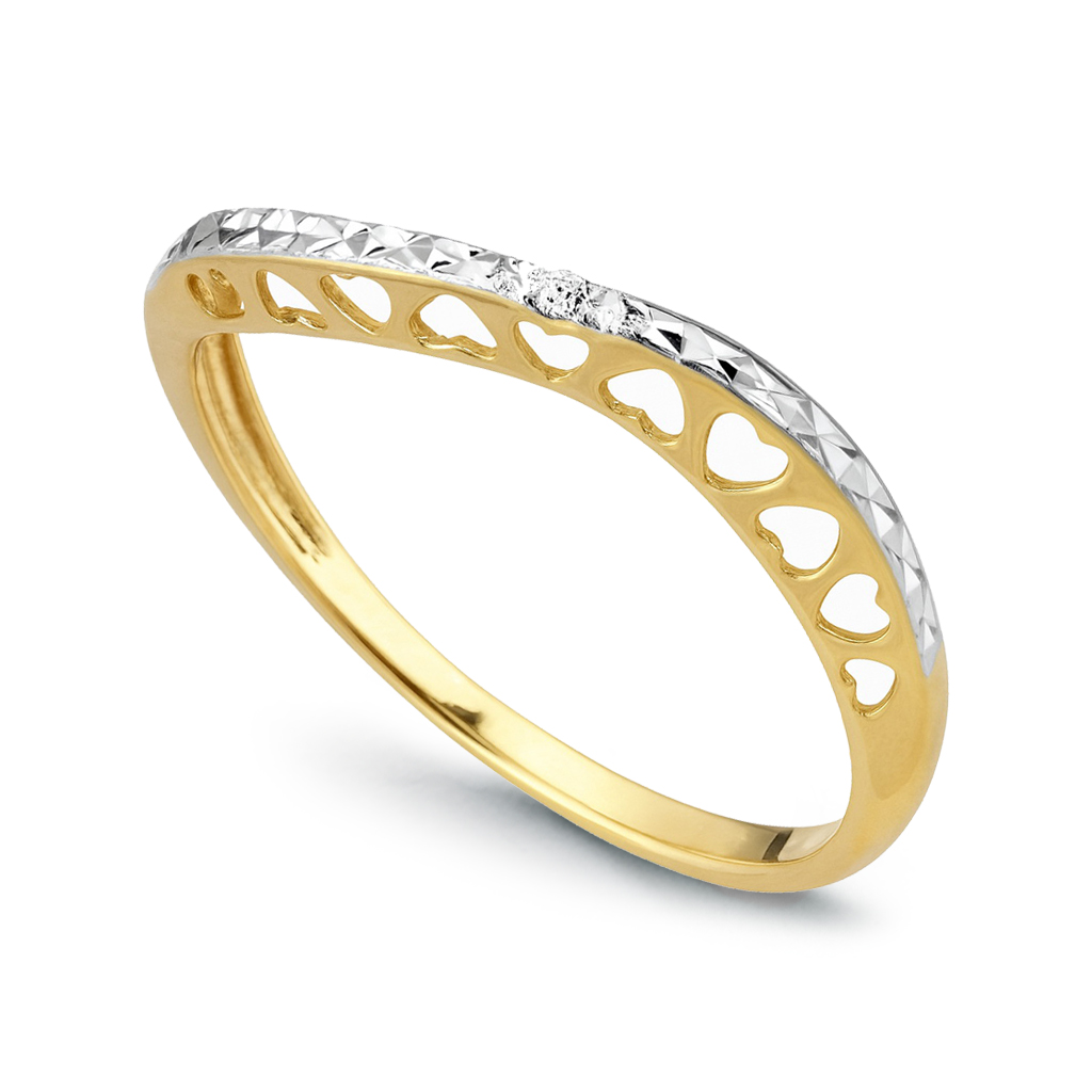 Uroczy pierścionek z żółtego i białego złota 14K, ozdobiony subtelnym diamentem oraz ażurowym wzorem w kształcie serduszek. Jego lekka, romantyczna forma zachwyca delikatnością i precyzyjnym wykonaniem. Lśniąca powierzchnia białego złota pięknie kontrastuje z ciepłym odcieniem żółtego złota, tworząc elegancką i kobiecą kompozycję. Idealny jako symbol uczuć lub wyjątkowy prezent dla bliskiej osoby.