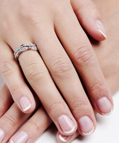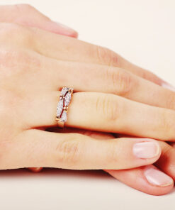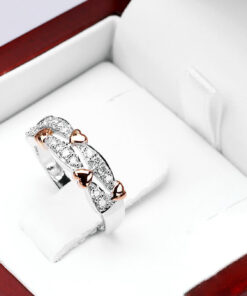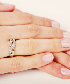 Zachwycający pierścionek zaręczynowy wykonany z 14-karatowego białego złota, dodatkowo ozdobiony akcentami z różowego złota, które subtelnie podkreślają jego romantyczny charakter. Dwa rzędy lśniących diamentów o łącznej masie 0,26 ct tworzą olśniewający wzór, przeplatany motywami serc, co nadaje mu wyjątkowej symboliki miłości. To niezwykle kobiecy i elegancki model, idealny dla osoby ceniącej nietuzinkowy styl i szlachetne detale.