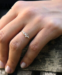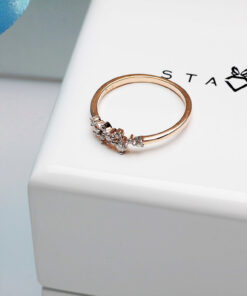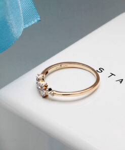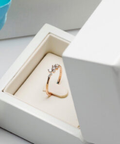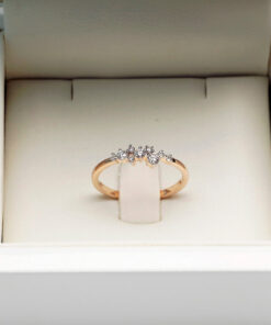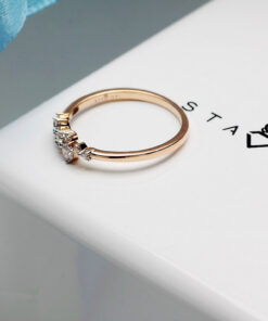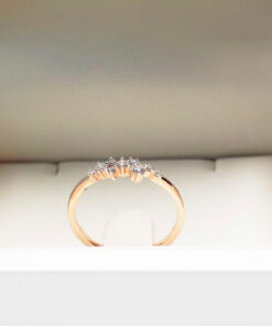 Subtelny i nowoczesny pierścionek zaręczynowy wykonany z żółtego złota próby 585. Jego korona zdobiona jest dziewięcioma diamentami o łącznej masie 0,20 ct, które układają się w lekką i asymetryczną kompozycję. Delikatna, smukła obrączka podkreśla blask kamieni, nadając całości wyjątkowej elegancji. To biżuteria stworzona dla kobiet ceniących oryginalne wzornictwo i ponadczasowy urok.