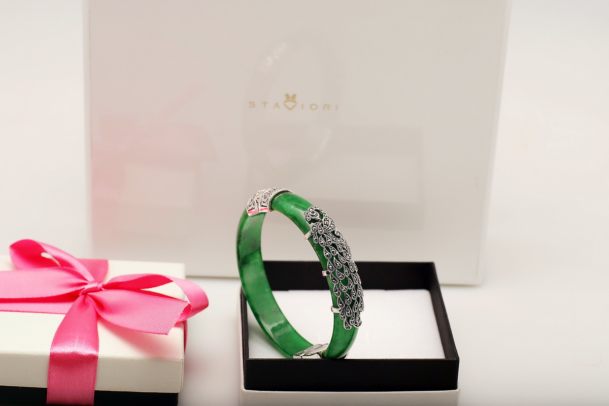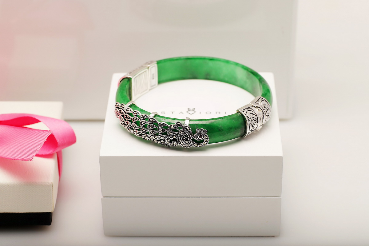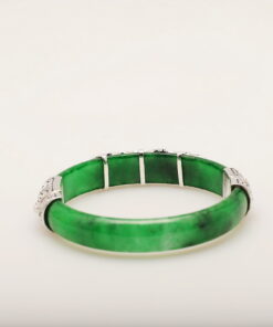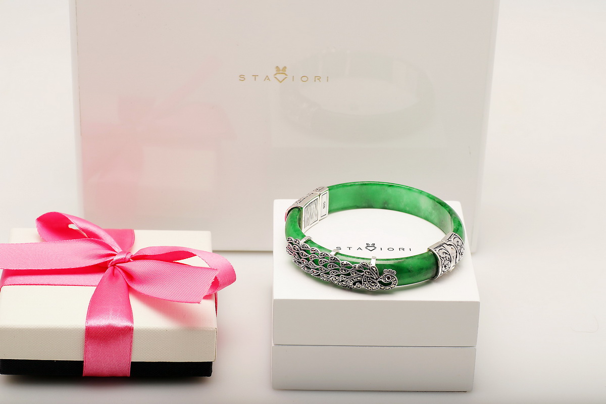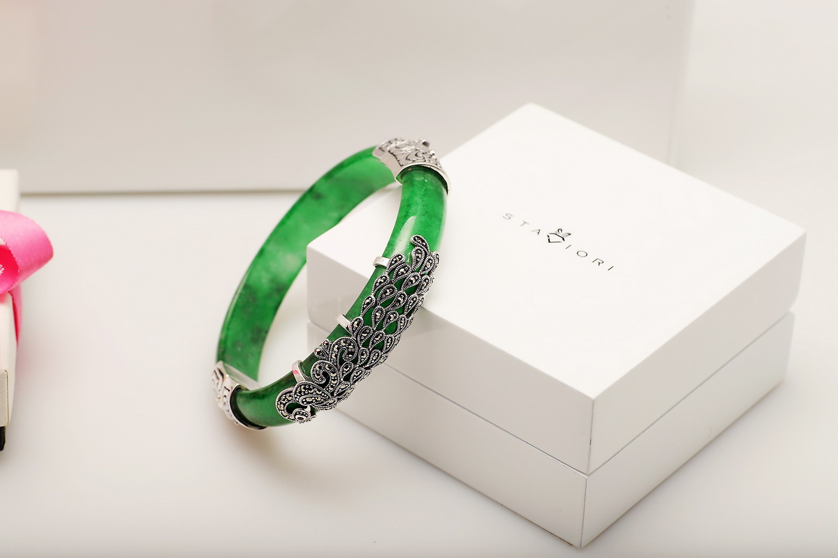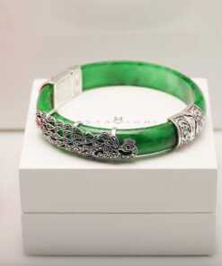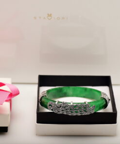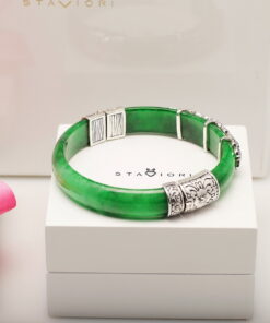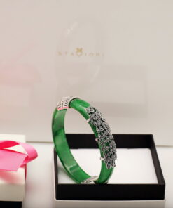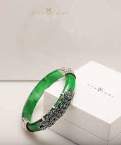 Wyjątkowa bransoleta wykonana z naturalnego jadeitu w intensywnie zielonym kolorze, ozdobiona markazytami osadzonymi w srebrze próby 0,925. Ręcznie zdobione, misternie wykonane detale nadają jej niezwykle artystycznego charakteru. Połączenie elegancji srebra i szlachetnego jadeitu sprawia, że jest to biżuteria, która przyciąga spojrzenia i podkreśla indywidualny styl.