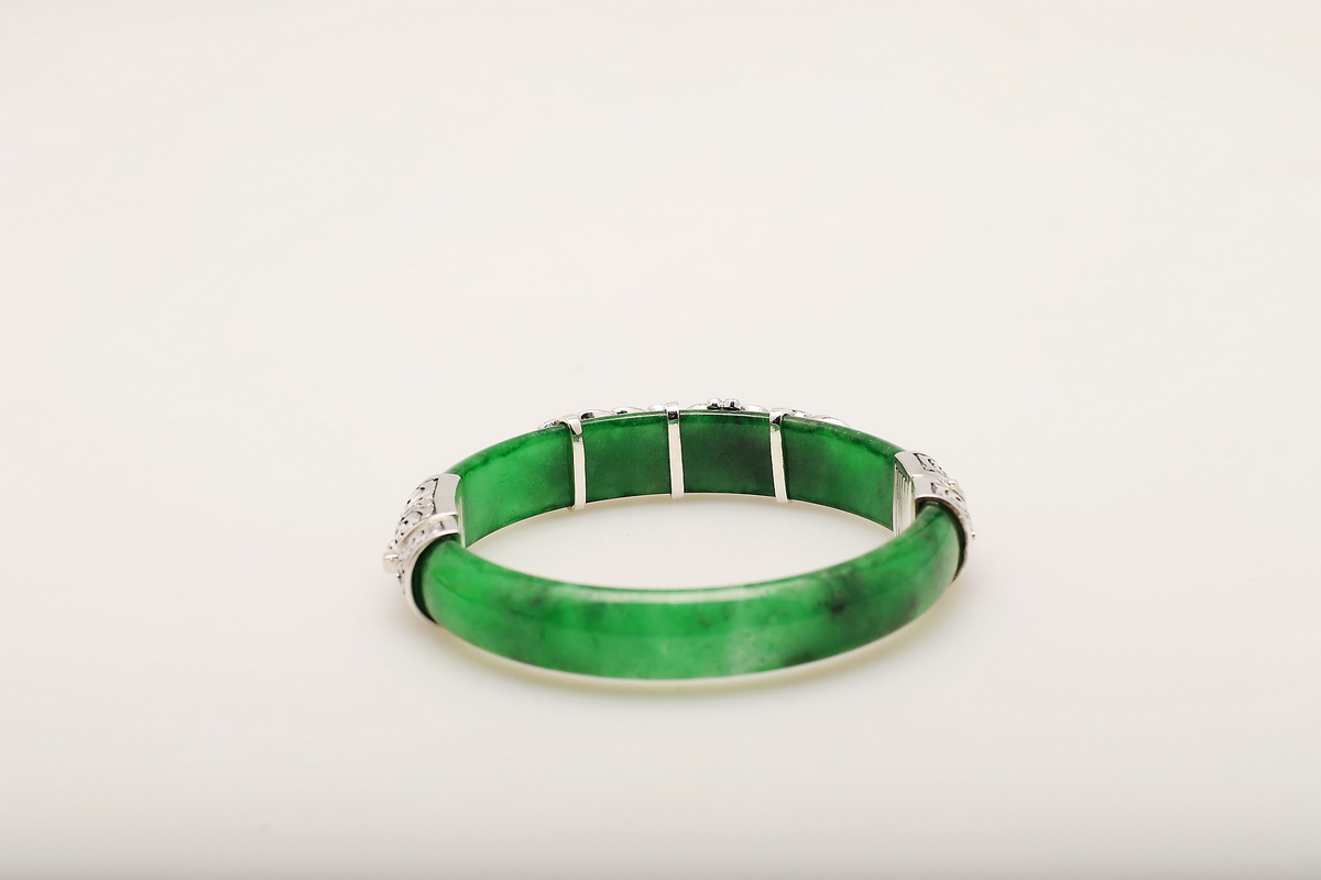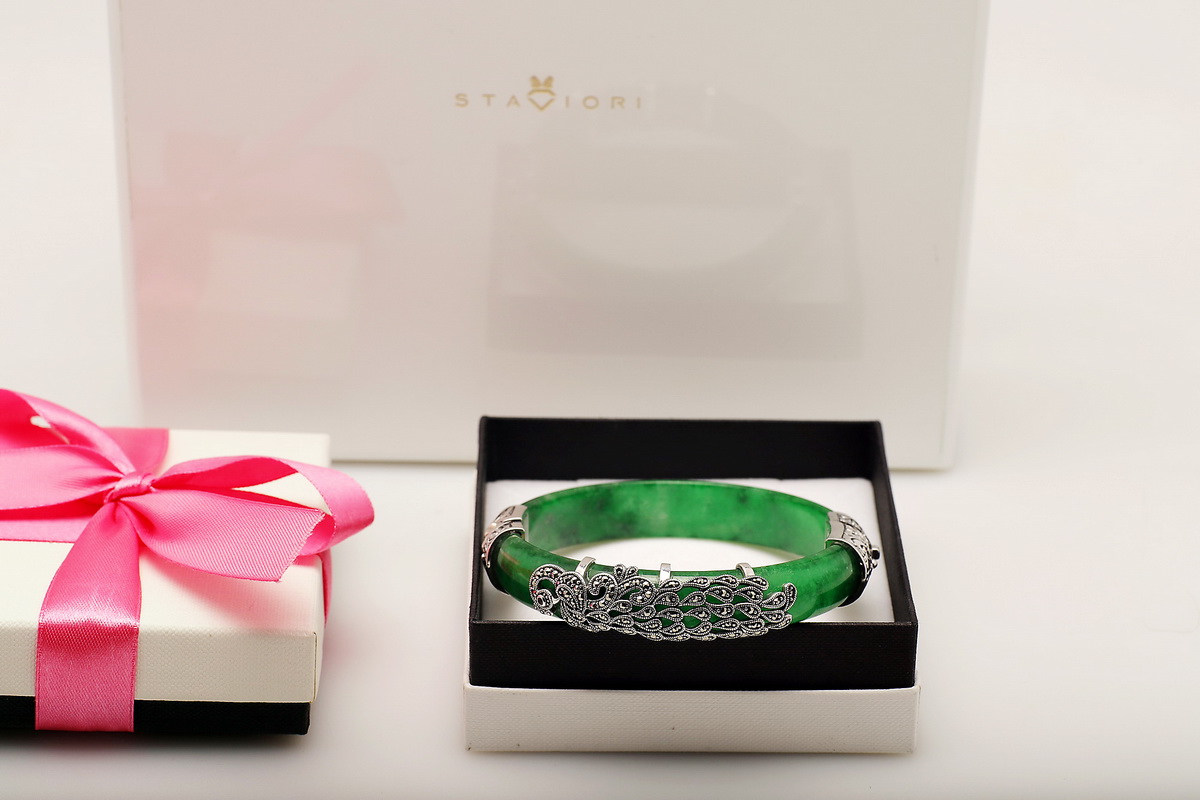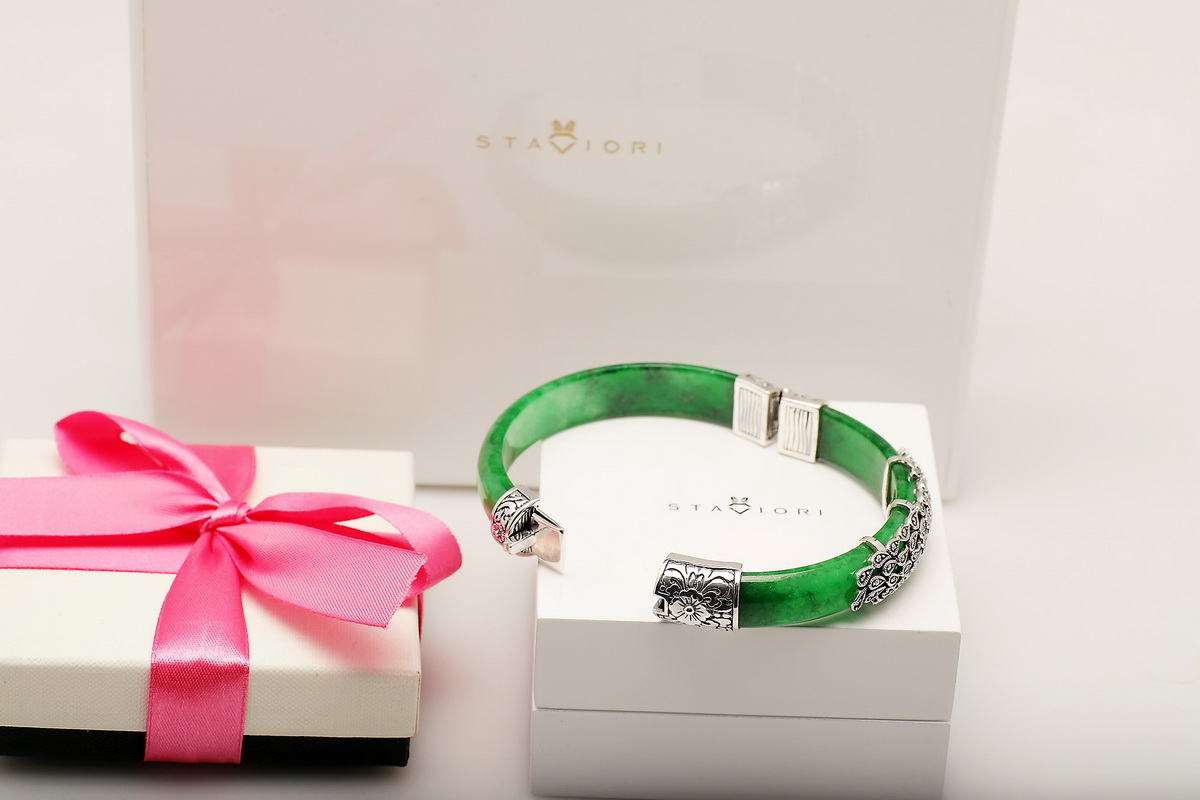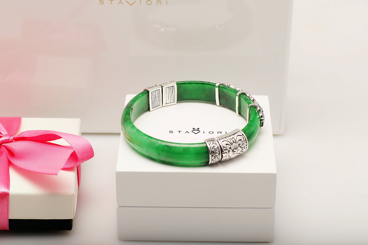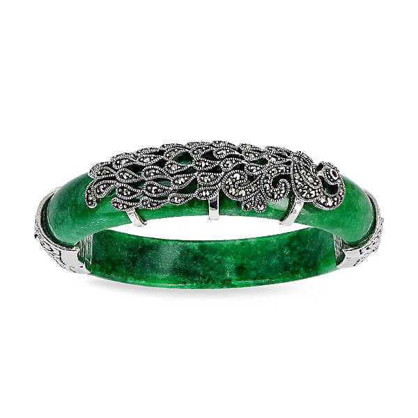 Wyjątkowa bransoleta wykonana z naturalnego jadeitu w intensywnie zielonym kolorze, ozdobiona markazytami osadzonymi w srebrze próby 0,925. Ręcznie zdobione, misternie wykonane detale nadają jej niezwykle artystycznego charakteru. Połączenie elegancji srebra i szlachetnego jadeitu sprawia, że jest to biżuteria, która przyciąga spojrzenia i podkreśla indywidualny styl.