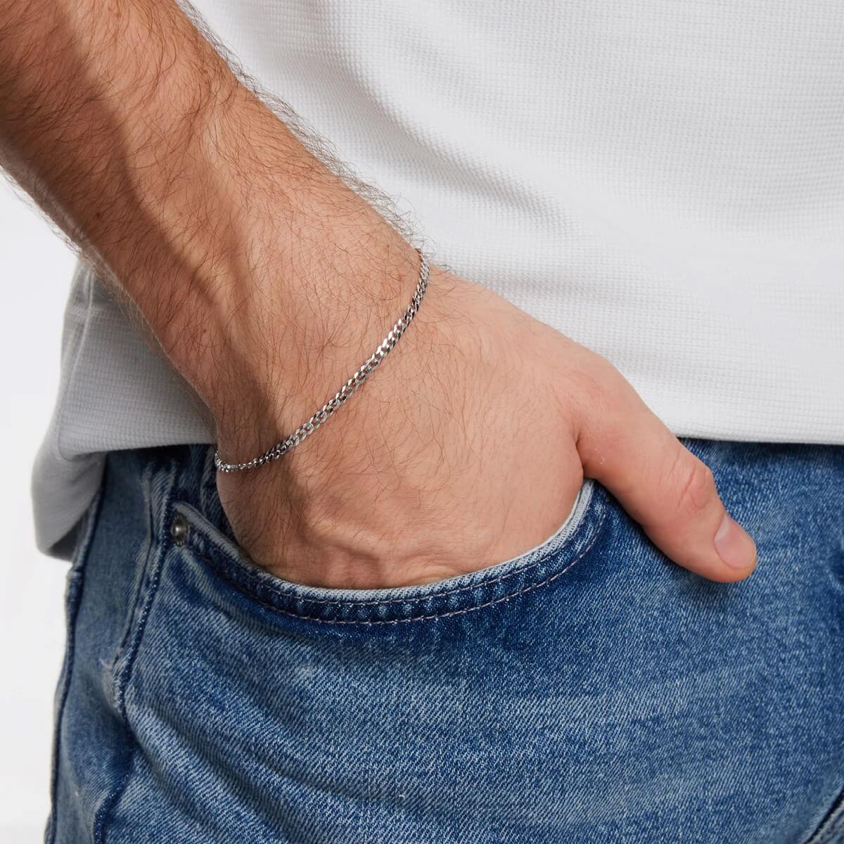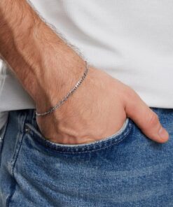 Elegancka bransoleta męska wykonana ze srebra rodowanego próby 0,925. Klasyczny splot o subtelnym połysku podkreśla nowoczesny charakter biżuterii, a rodowana powierzchnia gwarantuje trwałość i odporność na matowienie. Idealny dodatek zarówno do codziennych stylizacji, jak i eleganckich okazji.