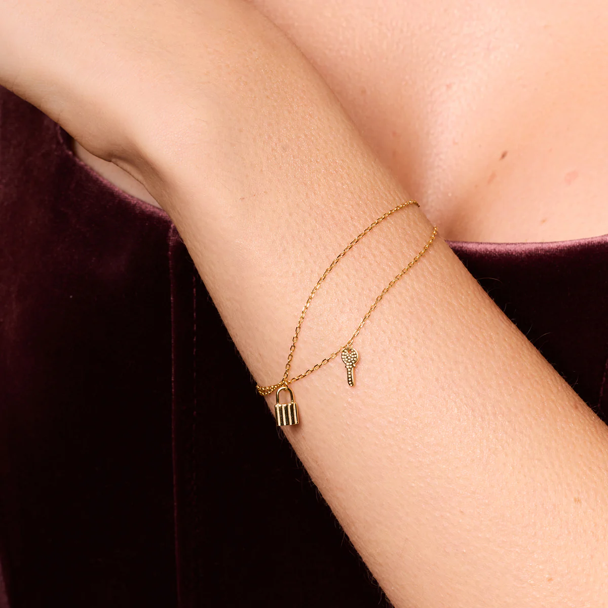 Uroczy komplet dwóch srebrnych bransoletek wykonanych z pozłacanego srebra próby 0,925, symbolizujących wyjątkową więź. Jedna ozdobiona zawieszką w kształcie kłódki, druga – kluczyka. Subtelne łańcuszki pięknie układają się na nadgarstku, a regulowana długość (16–19 cm) zapewnia idealne dopasowanie. Idealny zestaw dla jednej osoby, dwóch przyjaciółek lub zakochanej pary – biżuteria z przesłaniem, która mówi więcej niż słowa.